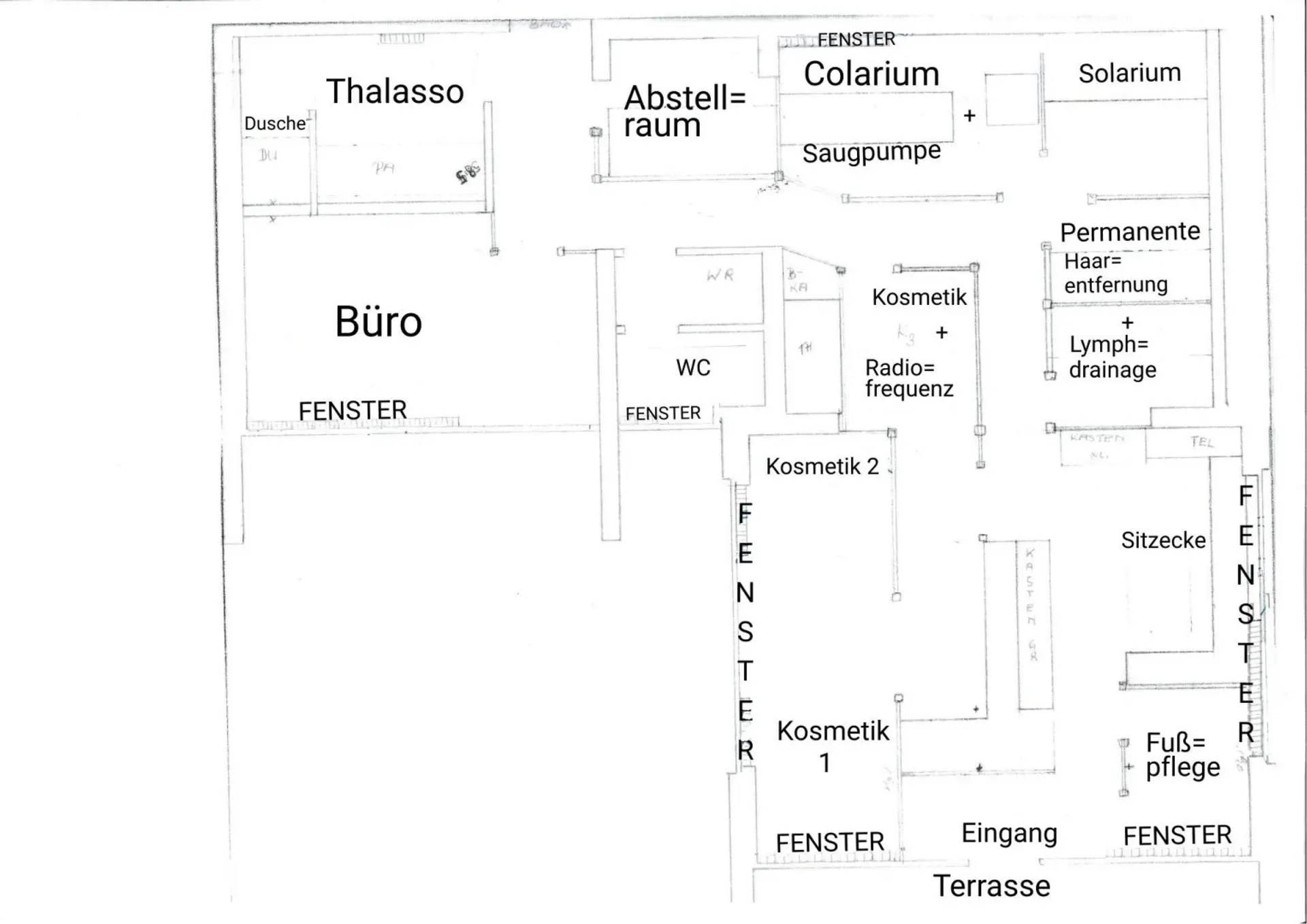 Der im Wohnungseigentum stehende, als Lokal gewidmete Kosmetiksalon liegt mitten in einer großen Wohnhausanlage in Purkersdorf. Der bautechnisch weitgehend offene Raum ist mittels mobiler Trennwände in 7 Kosmetikstationen unterteilt. Diese sind Kosmetik, Kosmetik mit Ultraschall, Microneedling und Radiofrequenz, Fusspflege, Permanente Haarentfernung und Lymphdrainage, Thalassobehandlungen, Colarium (Infrarot) mit Saugpumpe und Solarium (UV), ausgestattet mit allen notwendigen Geräten. Dusche und WC sind vorhanden.