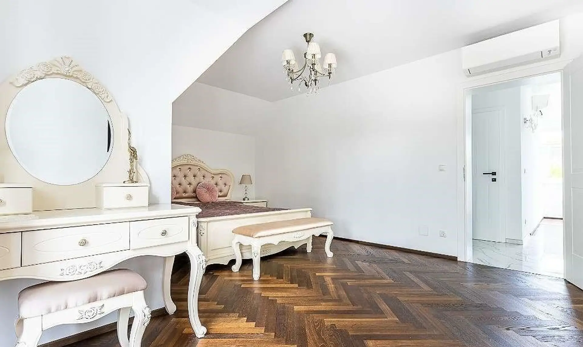 Die Stiege hinauf gelangt man an der hellen Galerie mit Glasboden - wo man locker einen Home-officeArbeitsplatz einrichten könnte - vorbei in die beiden luxuriös ausgestatteten Schlafzimmer mit jeweils eigenem Zugang zum südseitig ausgerichteten 15 m² großen Balkon - und sogar einem zweiten Kamin. Der Abstellraum fungiert als begehbarer Kleiderschrank und auf der anderen Seite befindet sich ein weiteres Badezimmer mit Doppelwaschbecken, Dusche und WC. Die Luft-Wasser-Wärmepumpe sorgt mit der Fußbodenheizung für Wohnkomfort im ganzen Haus. Nicht zuletzt begeistert jeden der niedrige Energiebedarf dieser fast neuwertigen Villa, welche noch viel Potenzial verbirgt. Man könnte von Photovoltaik bis Whirlpool noch einige Upgrades implementieren!