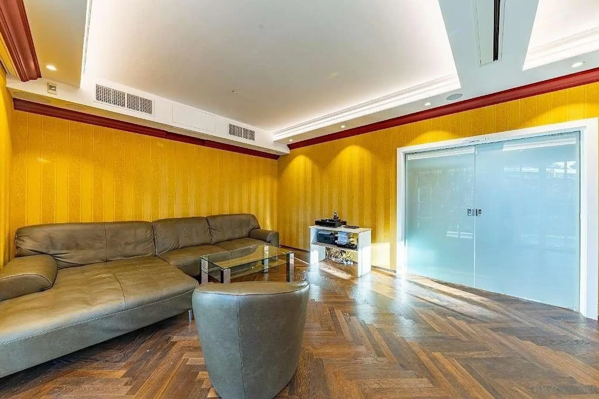 Der mondäne Wohnsalon mit 46 m² Wohnfläche, Fischgrätparkett und exklusivem Kamin lädt mit Leder-Wohnlandschaft zu gemütlichem Beisammensein mit Familie und Freunden. Die elektrischen Schiebetüren und die mittig integrierte Kino-Leinwand lassen sich bequem mit Fernbedienung von der Couch aus steuern und verwandeln den Raum in ein großes Heimkino mit Feeling wie im Cineplex!