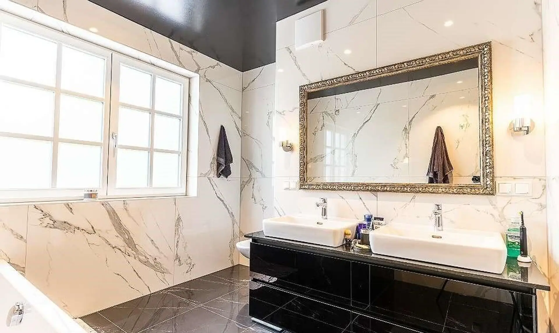 Von der Privatstraße fährt man in die gepflasterte Einfahrt mit Stellplätzen für mindestens zwei Autos und kommt in die großzügige Doppelgarage. Man betritt das Haus vom Vorgarten aus und kommt in den repräsentativen Vorraum mit Marmor-Stiegenhaus und Glas-Galerie im Obergeschoss.