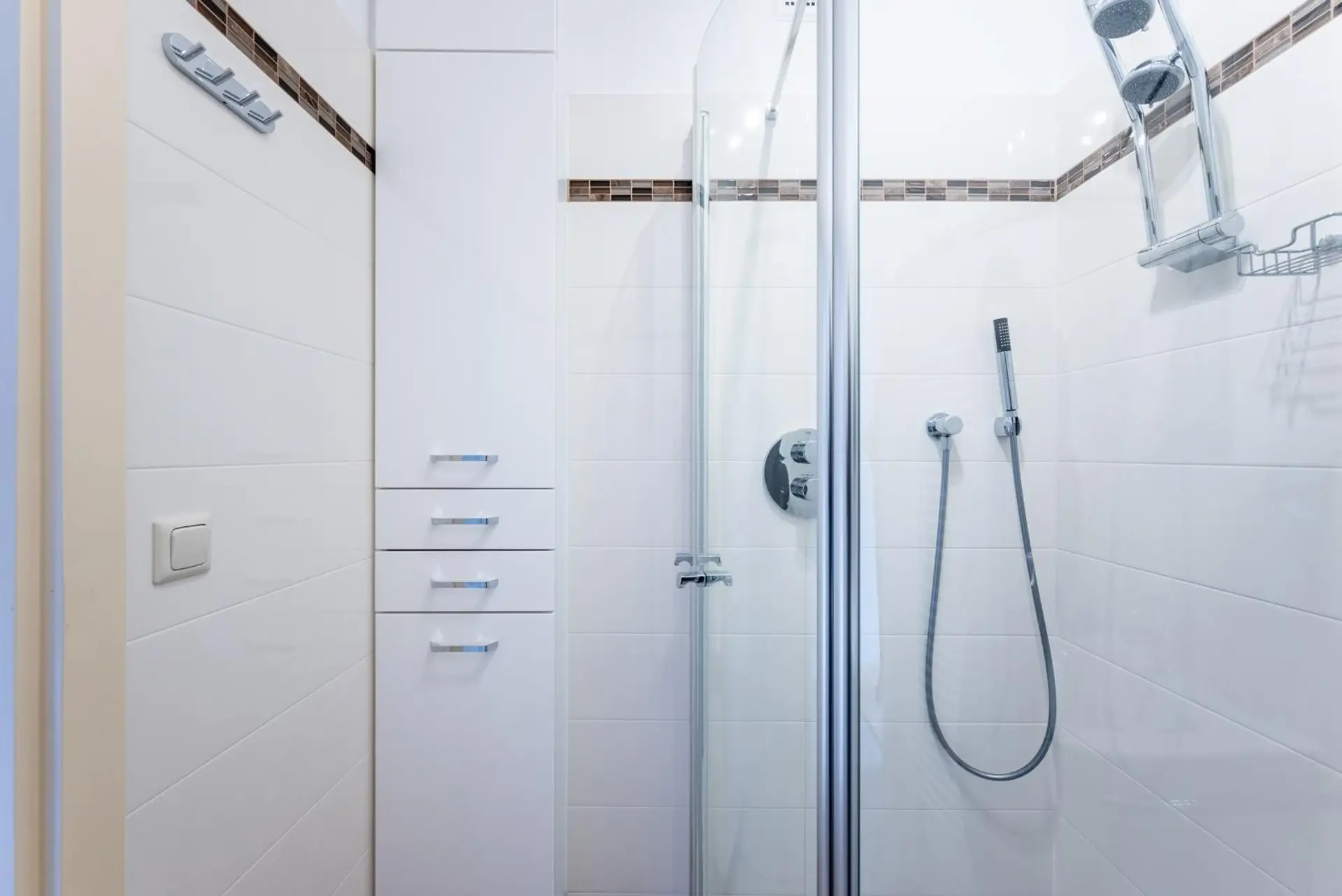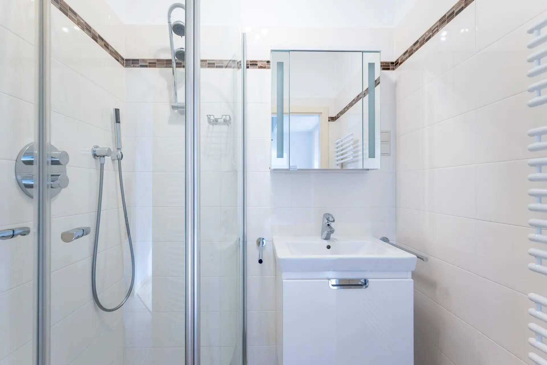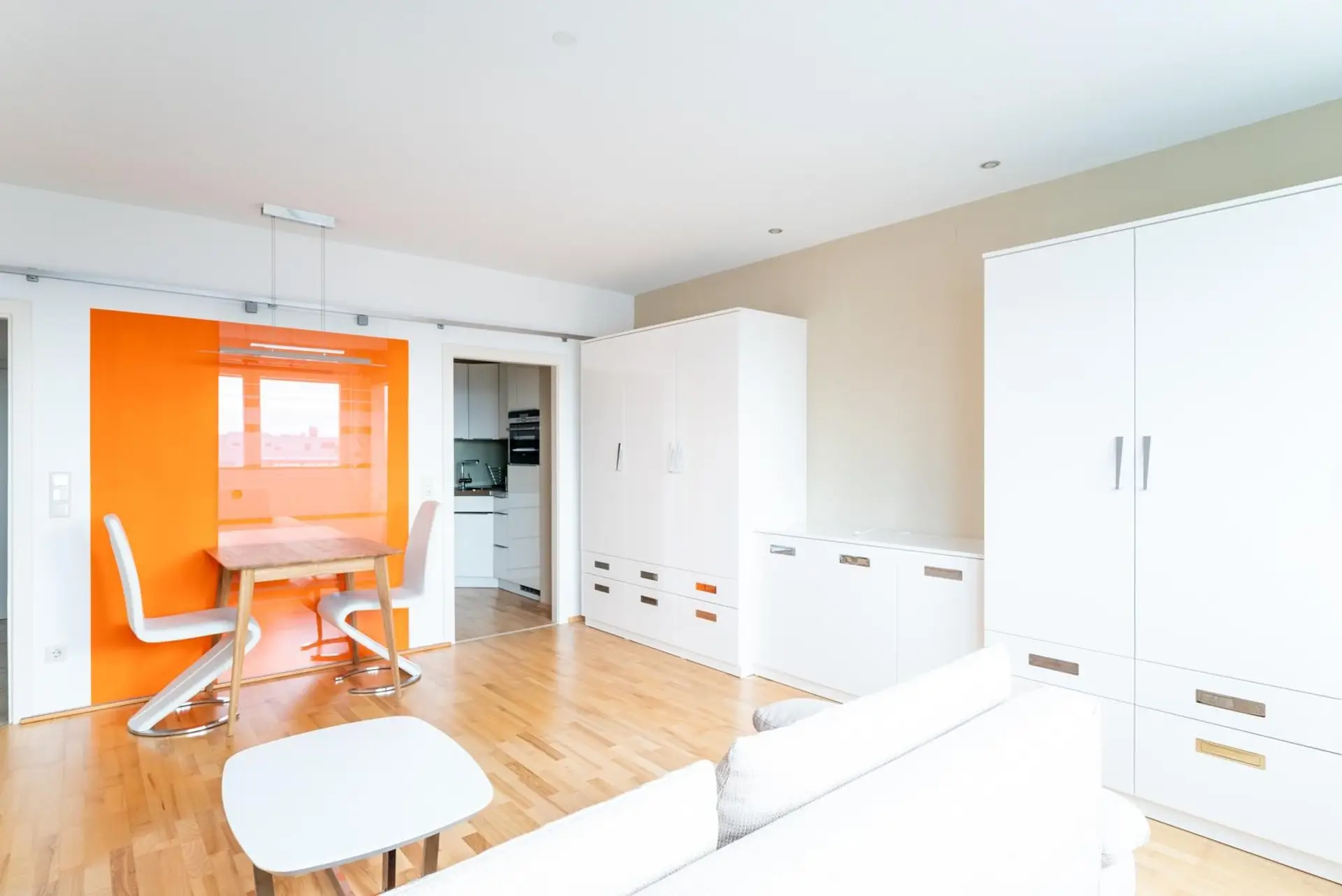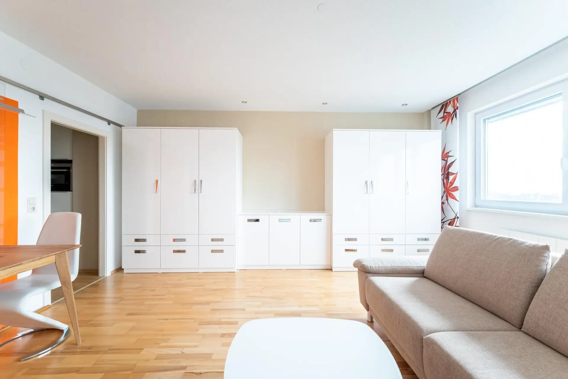 Layout: anteroom, toilet, bathroom with shower (no washing machine, as there is a laundry room) living area with sofa bed, high-quality built-in cupboards, dining table with 2 armchairs, invite you to eat, beautiful new kitchen with Miele appliances. (no dishwasher)