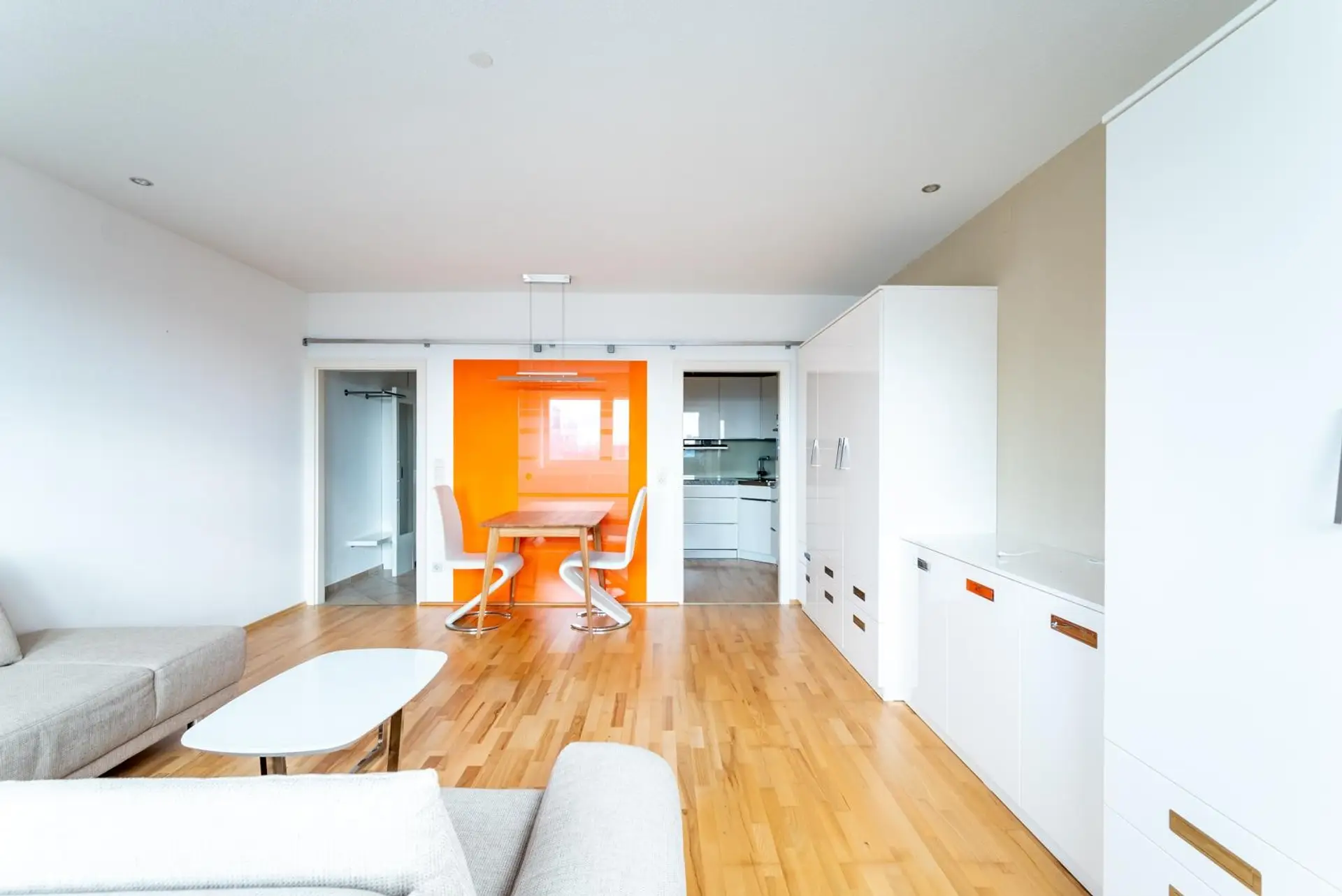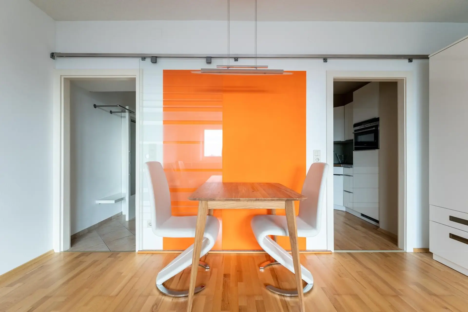Aufteilung: Vorzimmer, WC, Bad mit Dusche (keine Waschmaschine, da Waschküche vorhanden) Wohnbereich mit Schlafsofa, hochwertige Einbauschränke, Esstisch mit 2 Sesseln, laden zum Essen ein, schöne neue Danküche mit Miele Geräte. (kein Geschirrspüler)