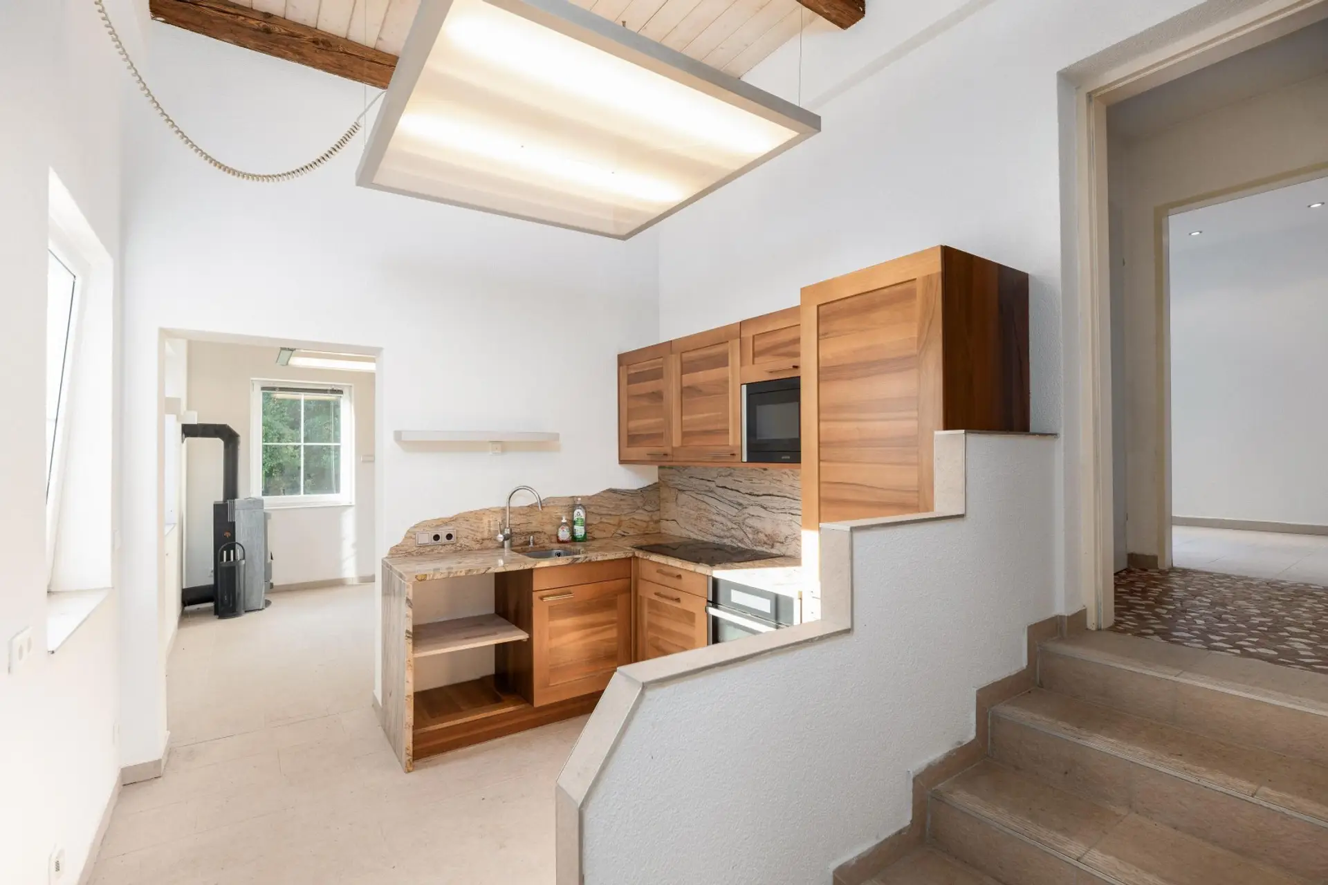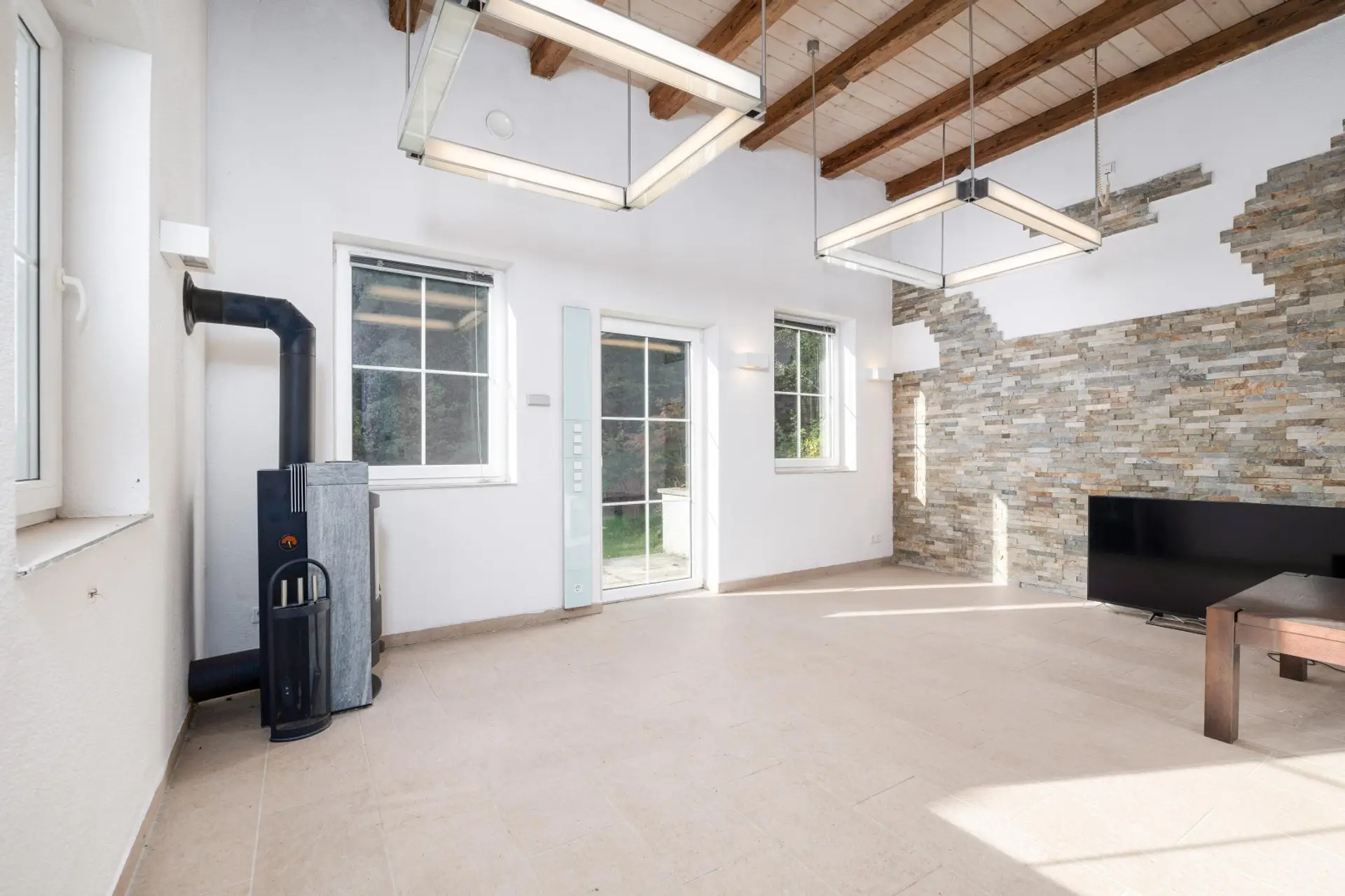 Wohnzimmer: Großzügiger, lichtdurchfluteter Wohnbereich mit modernem Beleuchtungskonzept, Holzofen und Zugang zur Terrasse sowie dem Garten. Die Steinwand verleiht dem Raum ein stilvolles Ambiente.