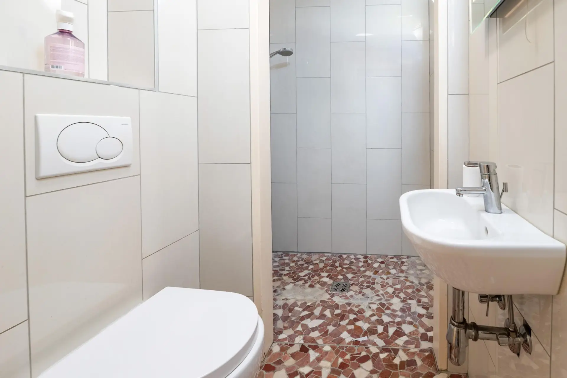 WC separat mit Dusche: Praktisch und modern mit Handwaschbecken.