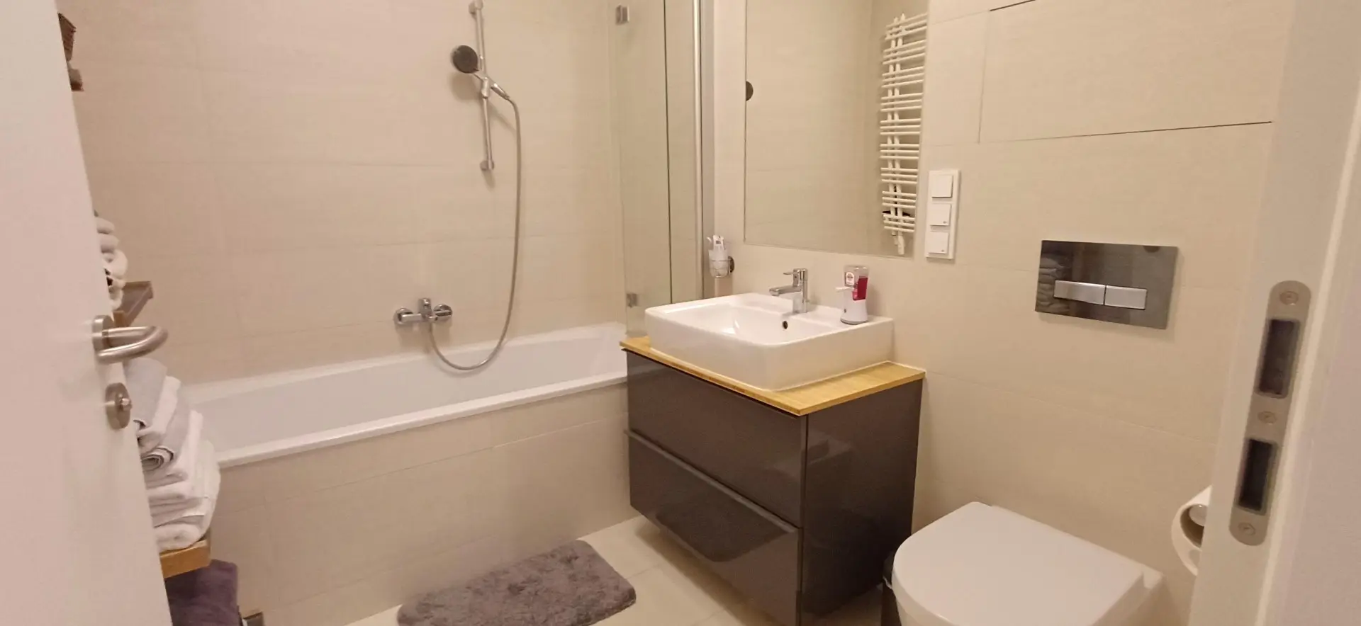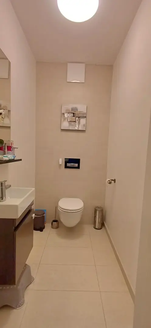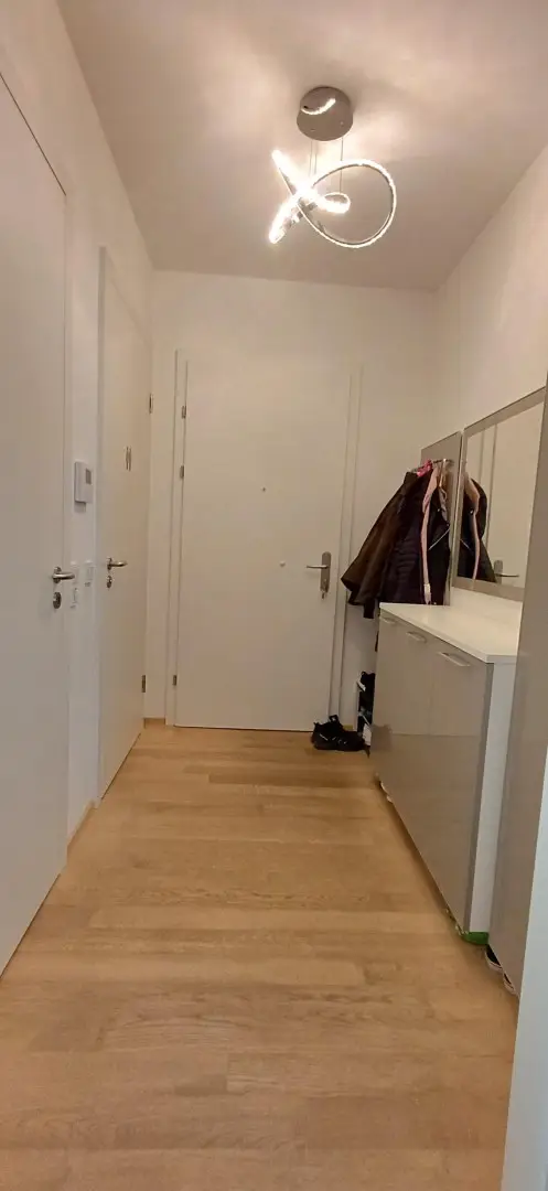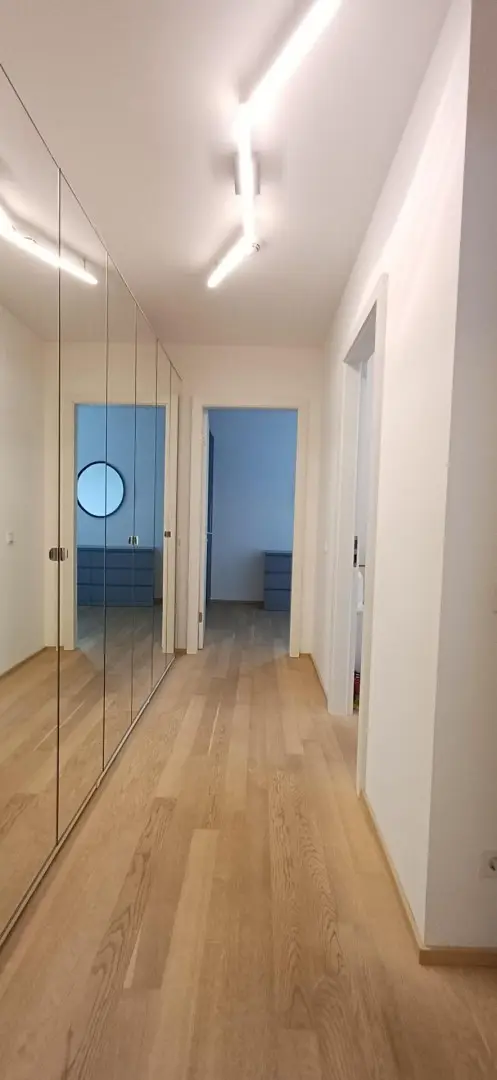 Die Wohnung verfügt über eine Klimaanlage, Fußbodenheizung sowie eine kontrollierte Wohnraumlüftung, die das ganze Jahr über für ein angenehmes Raumklima sorgt. Ein modernes Badezimmer, separates WC und ausreichend Stauraum – inklusive Kellerabteil und zusätzlichem Abstellraum direkt am Gang – runden das Angebot ab.