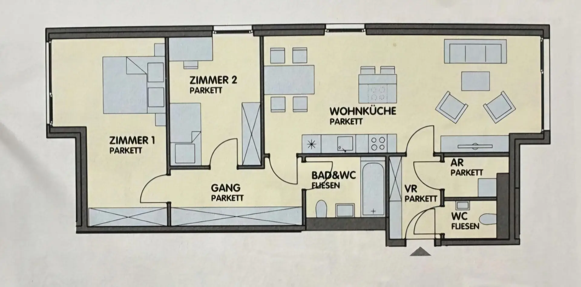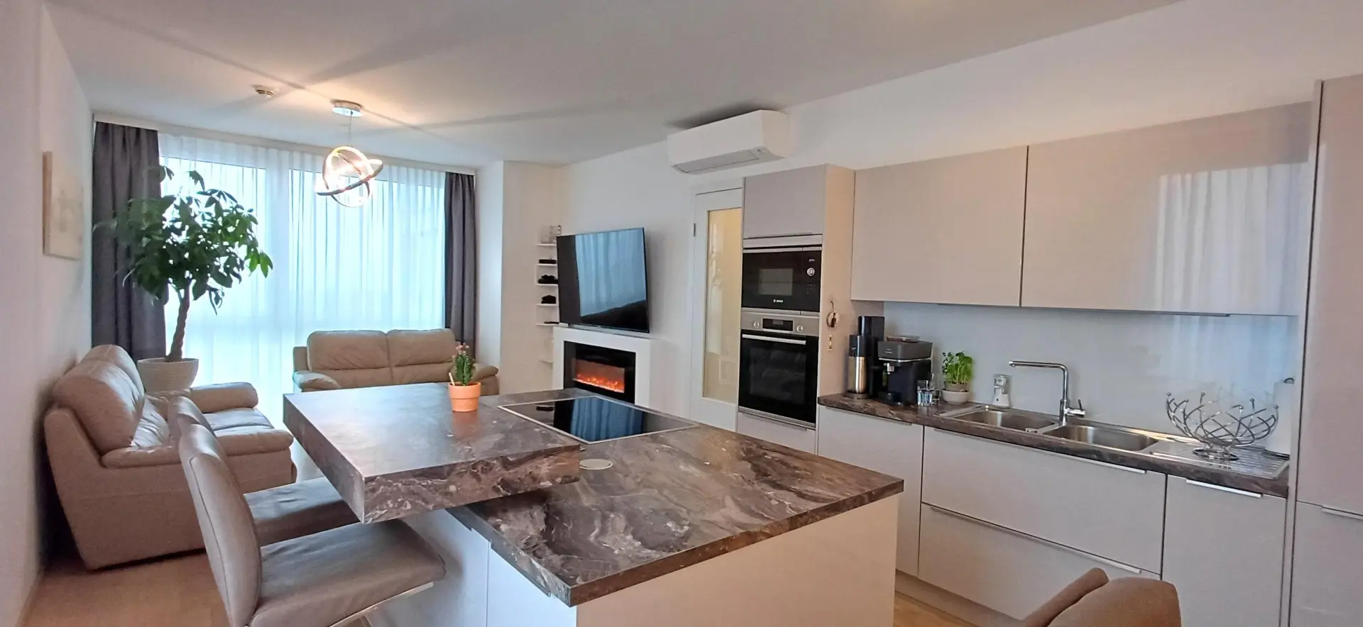 Der lichtdurchflutete Wohnbereich überzeugt mit bodentiefen Fenstern und großzügigem Schnitt. Die offene Raumgestaltung verbindet Wohnen, Essen und Kochen auf elegante Weise. Zwei weitere Zimmer eignen sich ideal als Schlafzimmer, Kinderzimmer oder Homeoffice. Hochwertige Materialien, ein edler Parkettboden und moderne Ausstattung sorgen für ein stilvolles Wohngefühl.