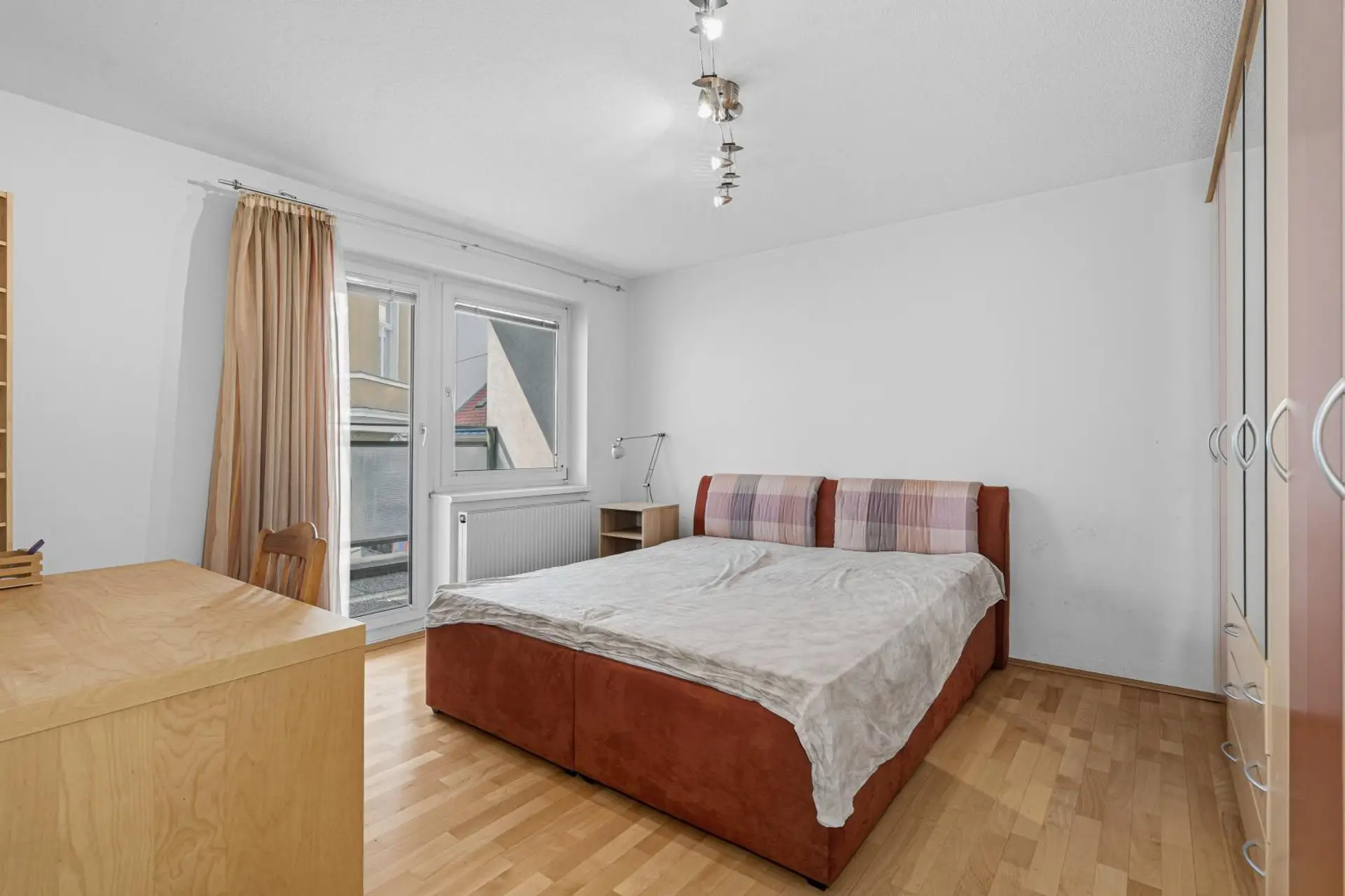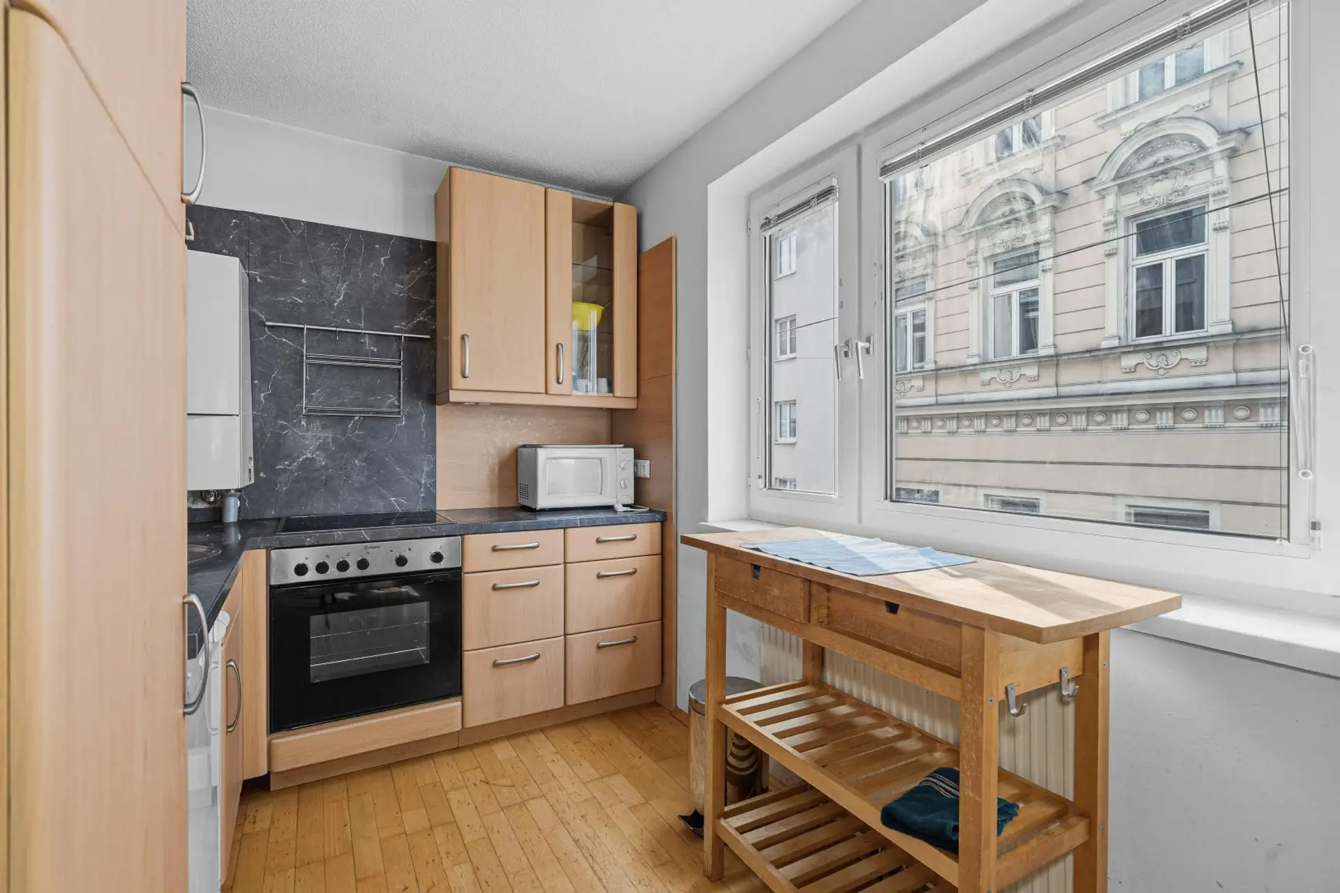 Derzeit verfügt die Wohnung über ein sehr großzügiges Wohnzimmer mit offener Wohnküche sowie ein Schlafzimmer. Beide Räume sind mit Parkettboden (Buche natur) ausgestattet und bieten Zugang zur westseitigen ca. 5m² großen Loggia mit Blick auf die ruhige Karmeliterhofgasse.