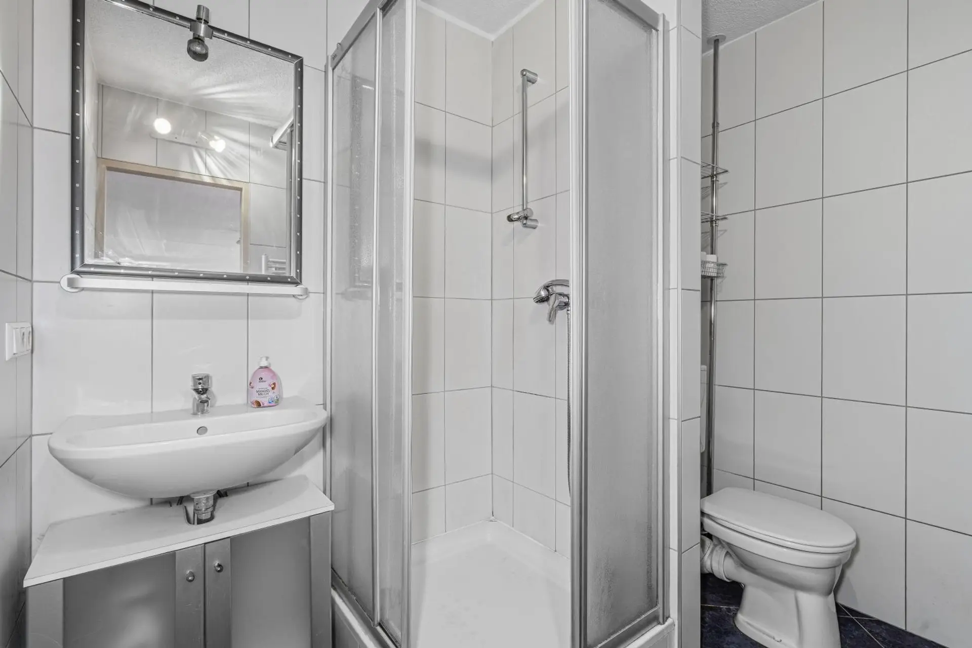 Das Badezimmer ist komplett verfliest und verfügt über: Dusche, Waschbecken, Handtuchheizkörper, WC