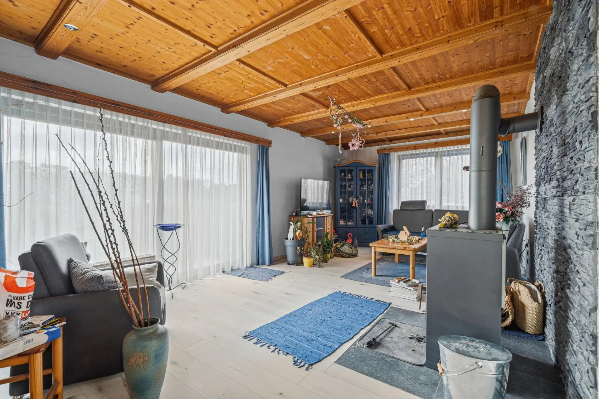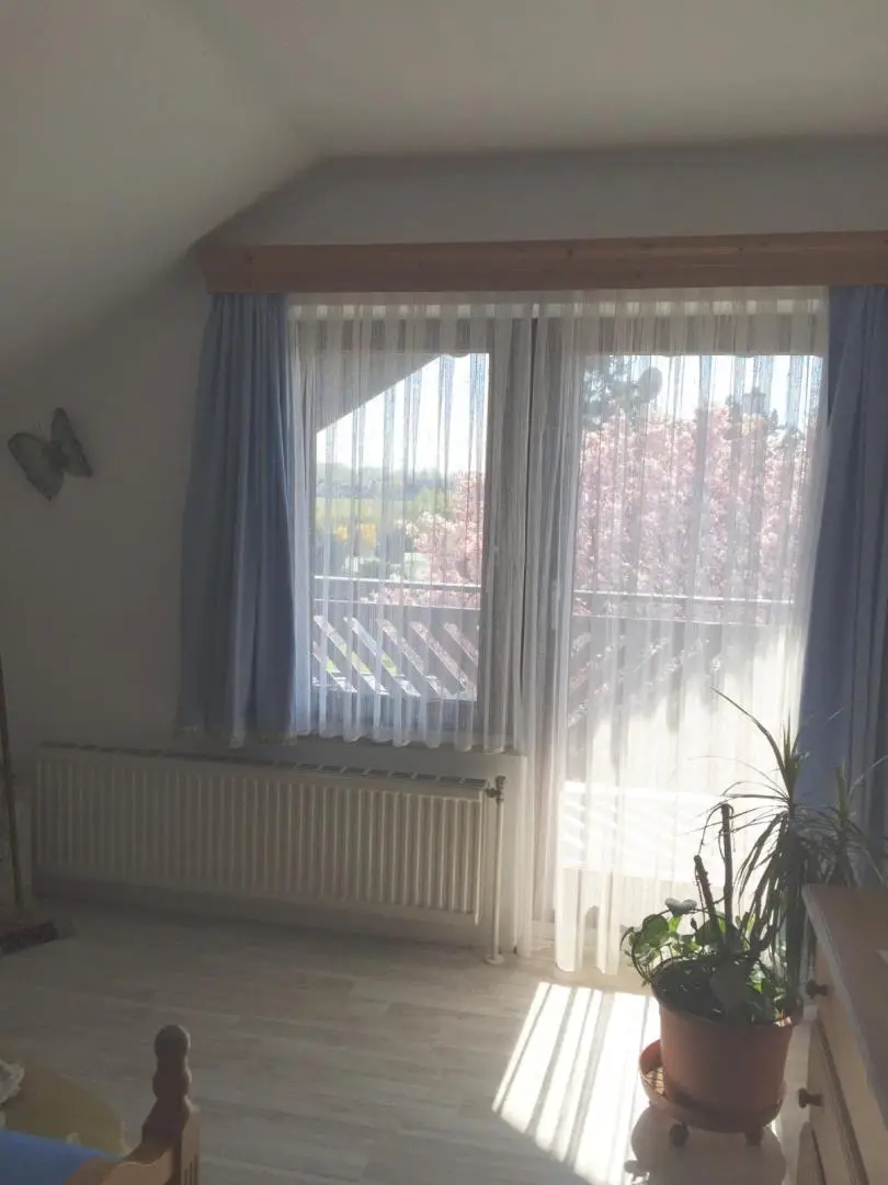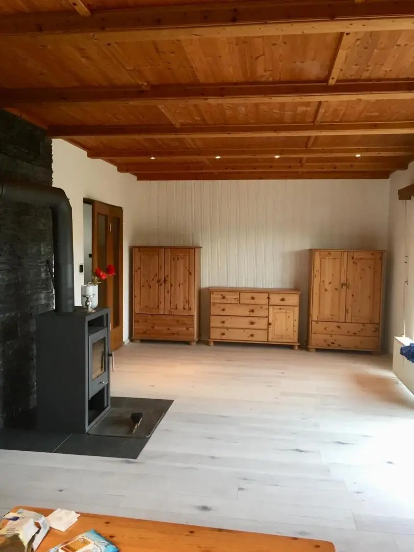 On the ground floor, there is a welcoming entrance hall, a kitchen, a bathroom with WC, and a large, light-filled living room with direct access to the garden. A special highlight is the cozy fireplace in the living area, providing pleasant warmth and a comfortable atmosphere, especially during the transitional seasons.