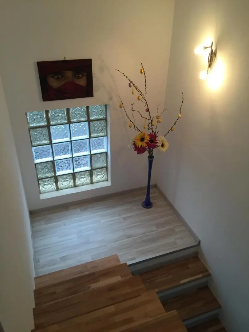 On the upper floor, there are three bedrooms, two of which have access to a loggia, as well as another bathroom and a separate WC. The house is fully basemented and offers a total of six rooms, including a technical room with heating equipment and an additional WC.
