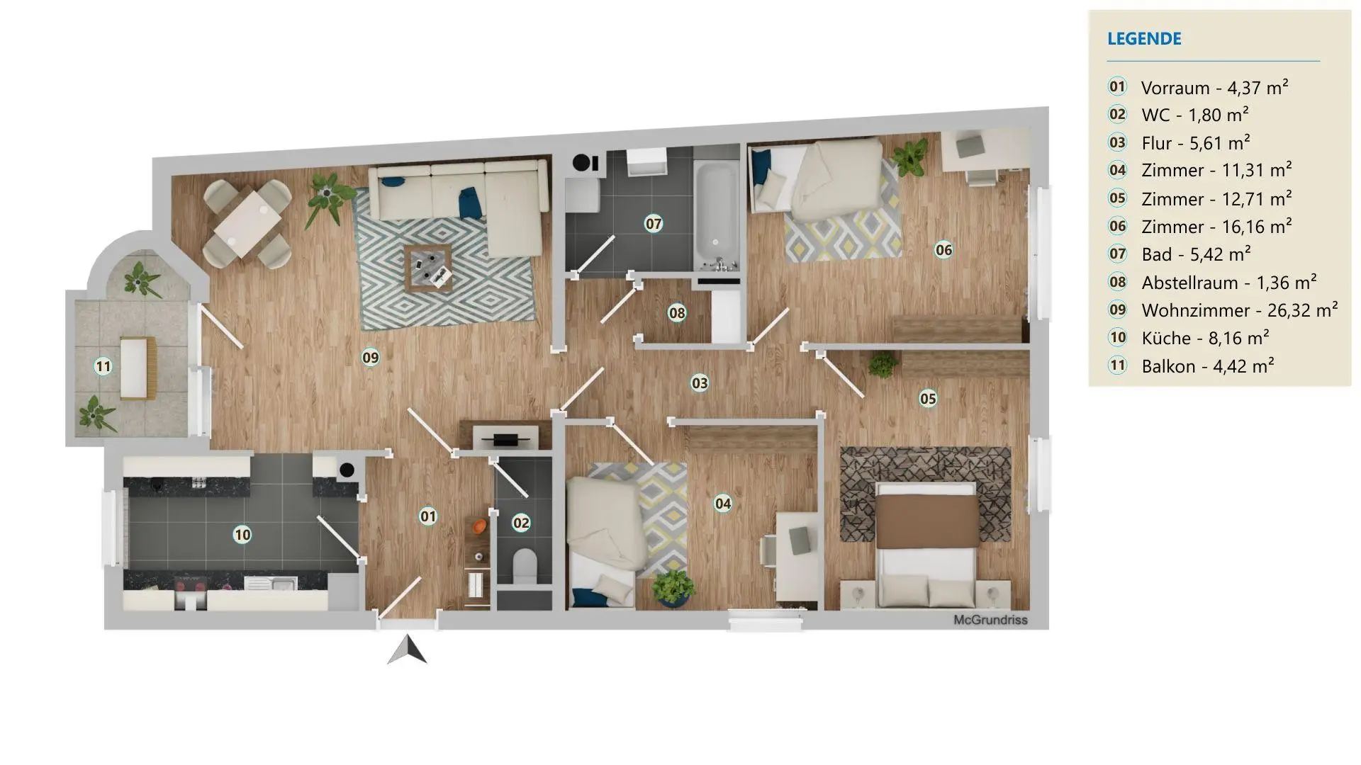 Ein kurzer, optimal geplanter Flurbereich (5,61 m²) trennt den privaten Bereich angenehm vom Wohnbereich. Von hier aus erreichen Sie: