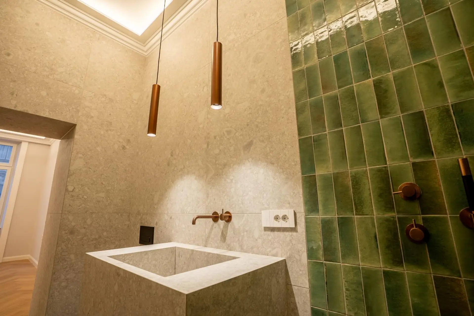 • Stilvoller Deckenstuck und elegante Wandvertäfelungen im klassischen Alt-Wien-Stil