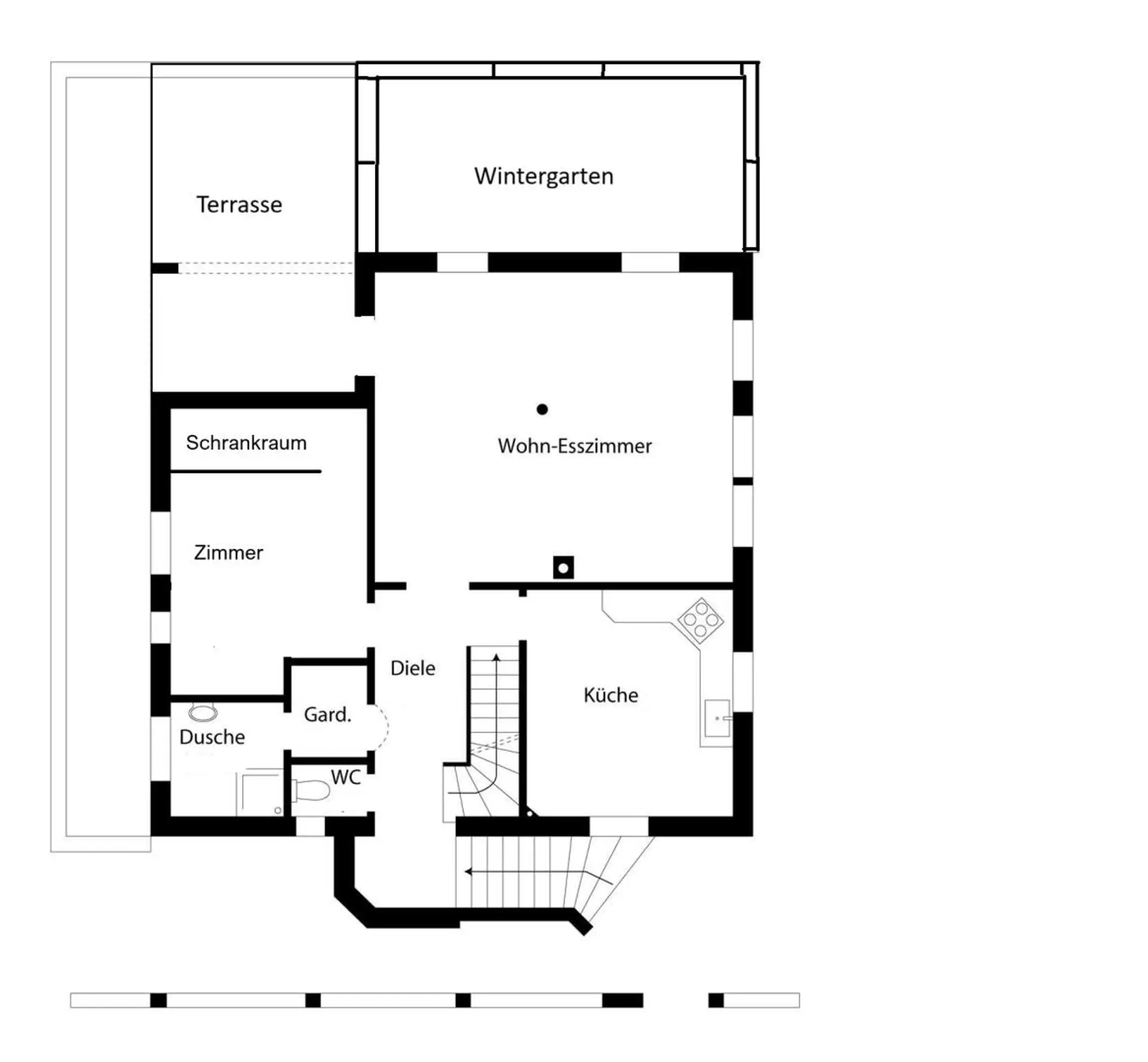 - ein Badezimmer mit Dusche und ein separates WC.
