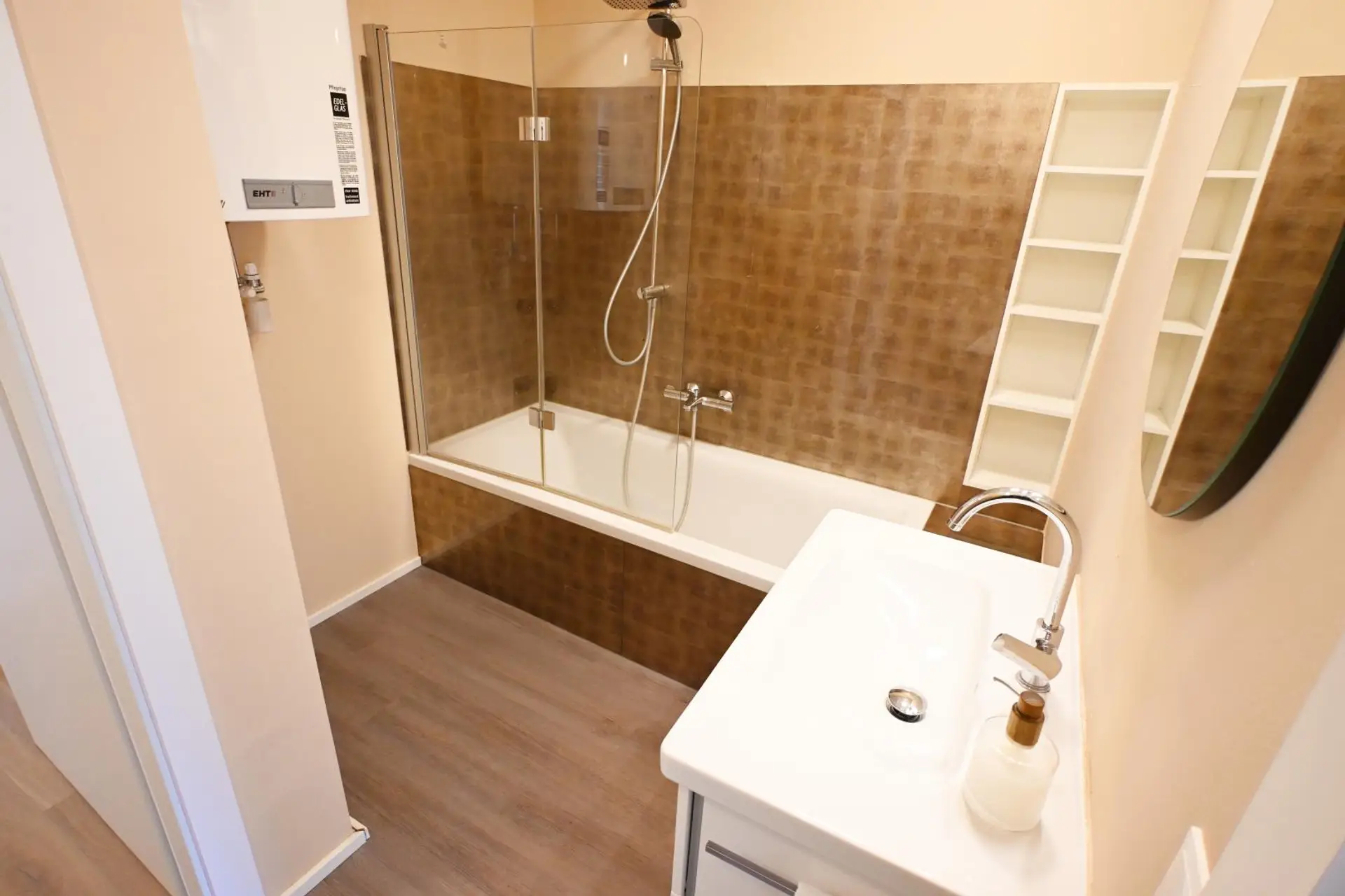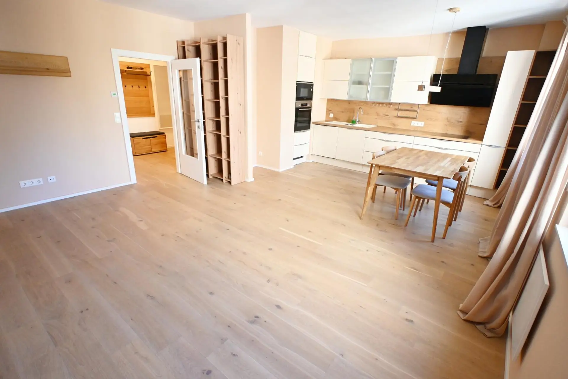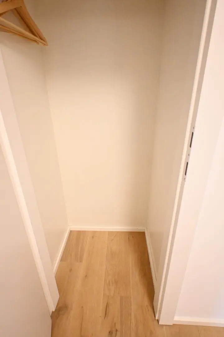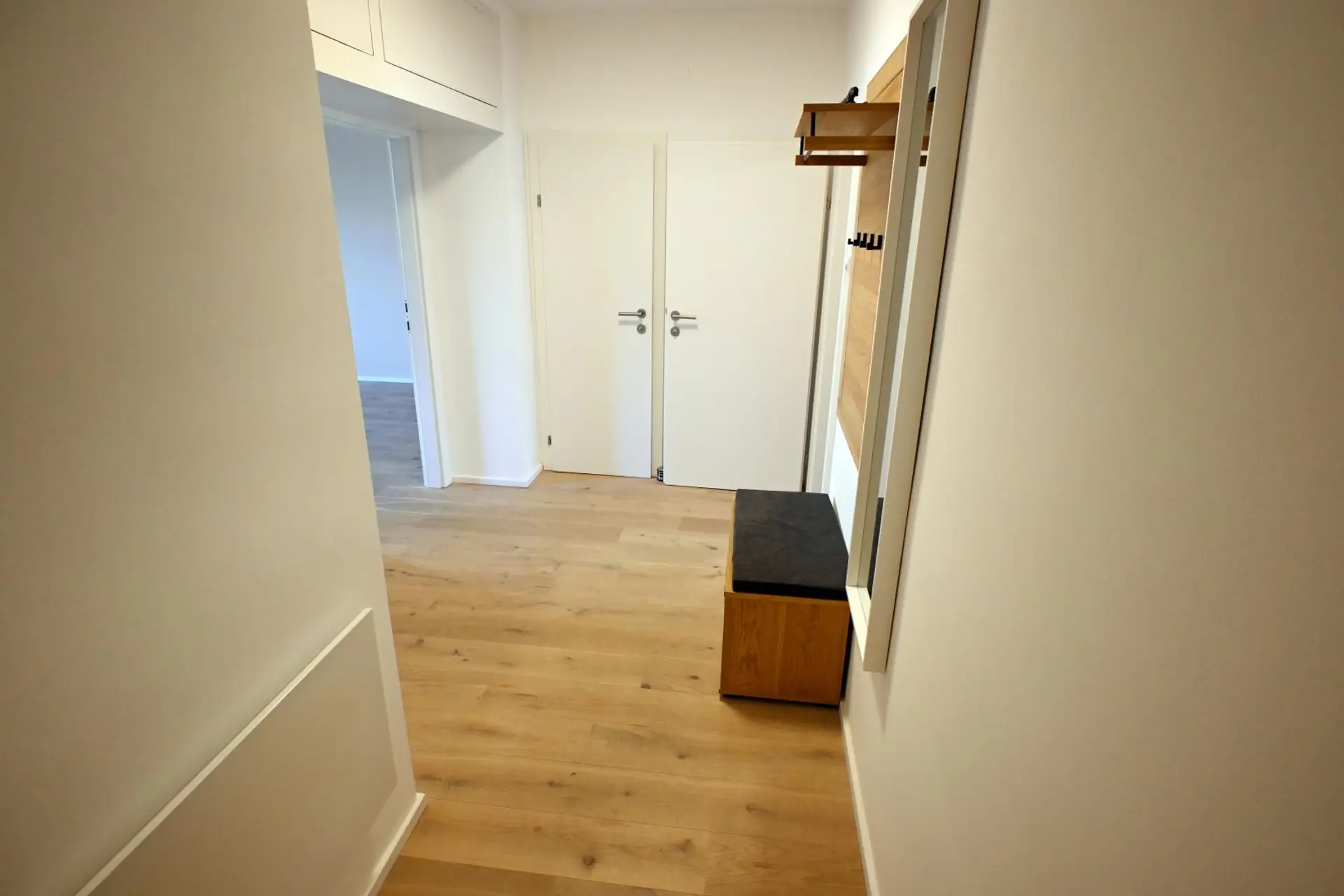 Über den Vorraum erreicht man den großen Wohn-Essbereich, das Badezimmer, über das man in den zweiten, kleineren Wohnraum gelangt, das separate WC sowie den praktischen Abstellraum. Im Wohnzimmer ist eine komplette Küchenzeile inklusive Geräte integriert. Im Badezimmer steht eine Badewanne mit Dusche sowie ein Waschmaschinenanschluss zur Verfügung. Geheizt wird mit effizienten Infrarotpaneelen.