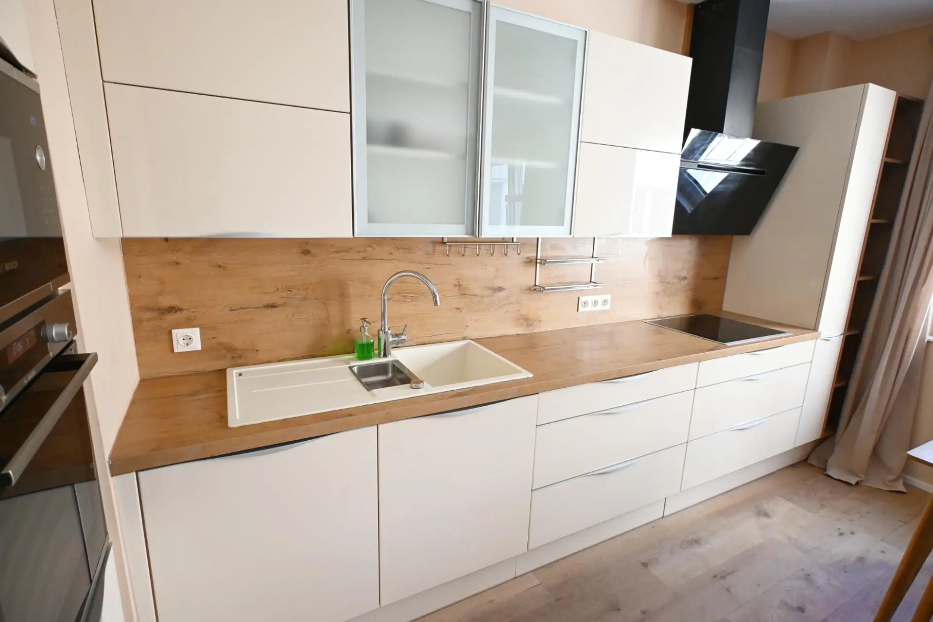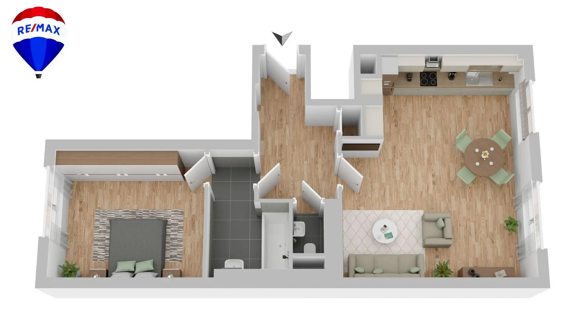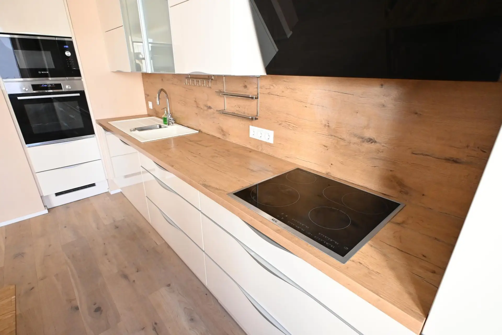 Über den Vorraum erreicht man den großen Wohn-Essbereich, das Badezimmer, über das man in den zweiten, kleineren Wohnraum gelangt, das separate WC sowie den praktischen Abstellraum. Im Wohnzimmer ist eine komplette Küchenzeile inklusive Geräte integriert. Im Badezimmer steht eine Badewanne mit Dusche sowie ein Waschmaschinenanschluss zur Verfügung. Geheizt wird mit effizienten Infrarotpaneelen.
