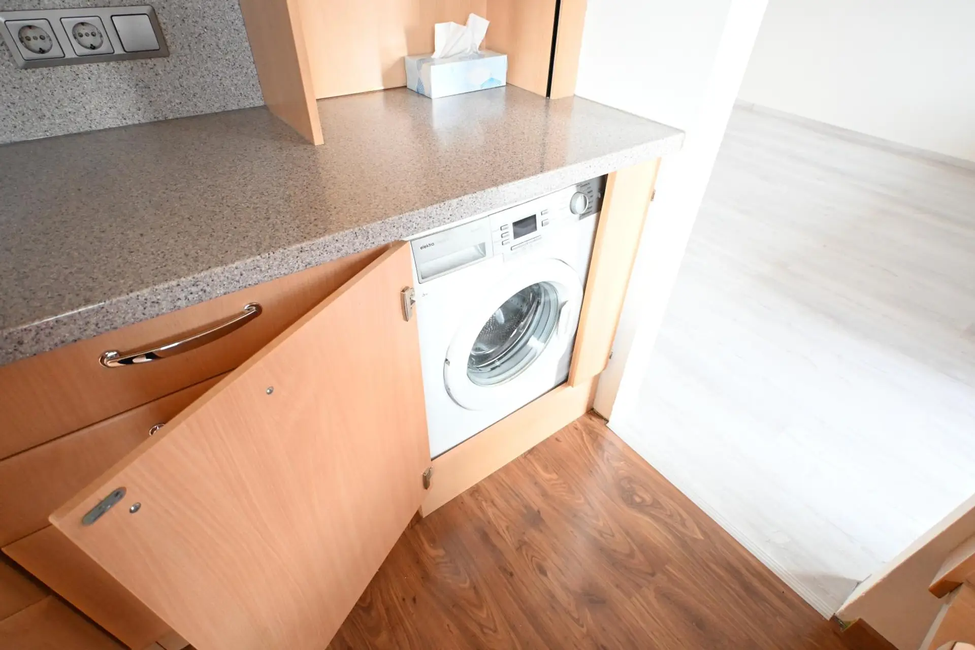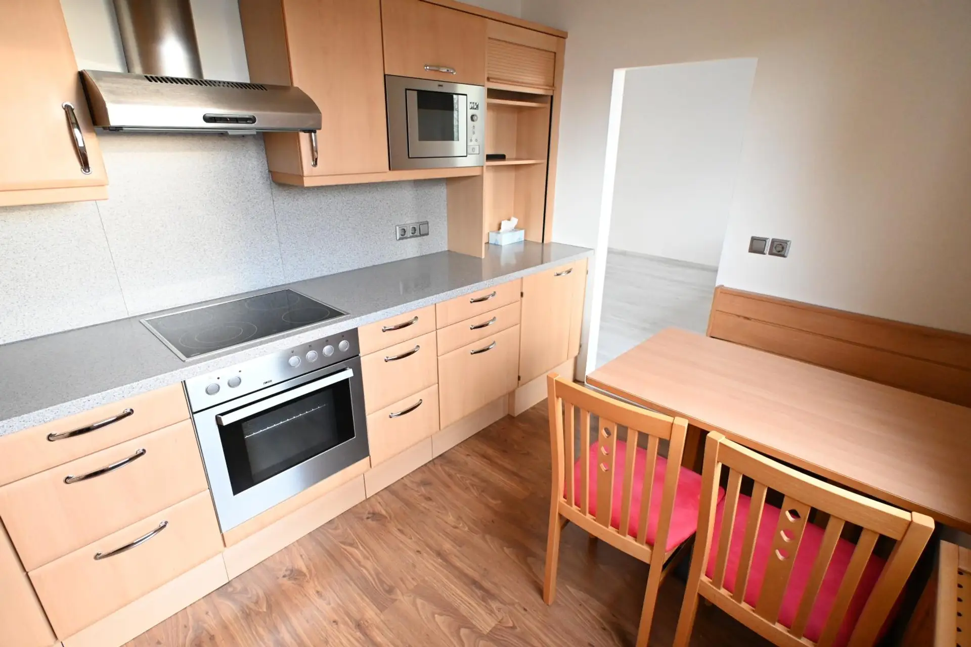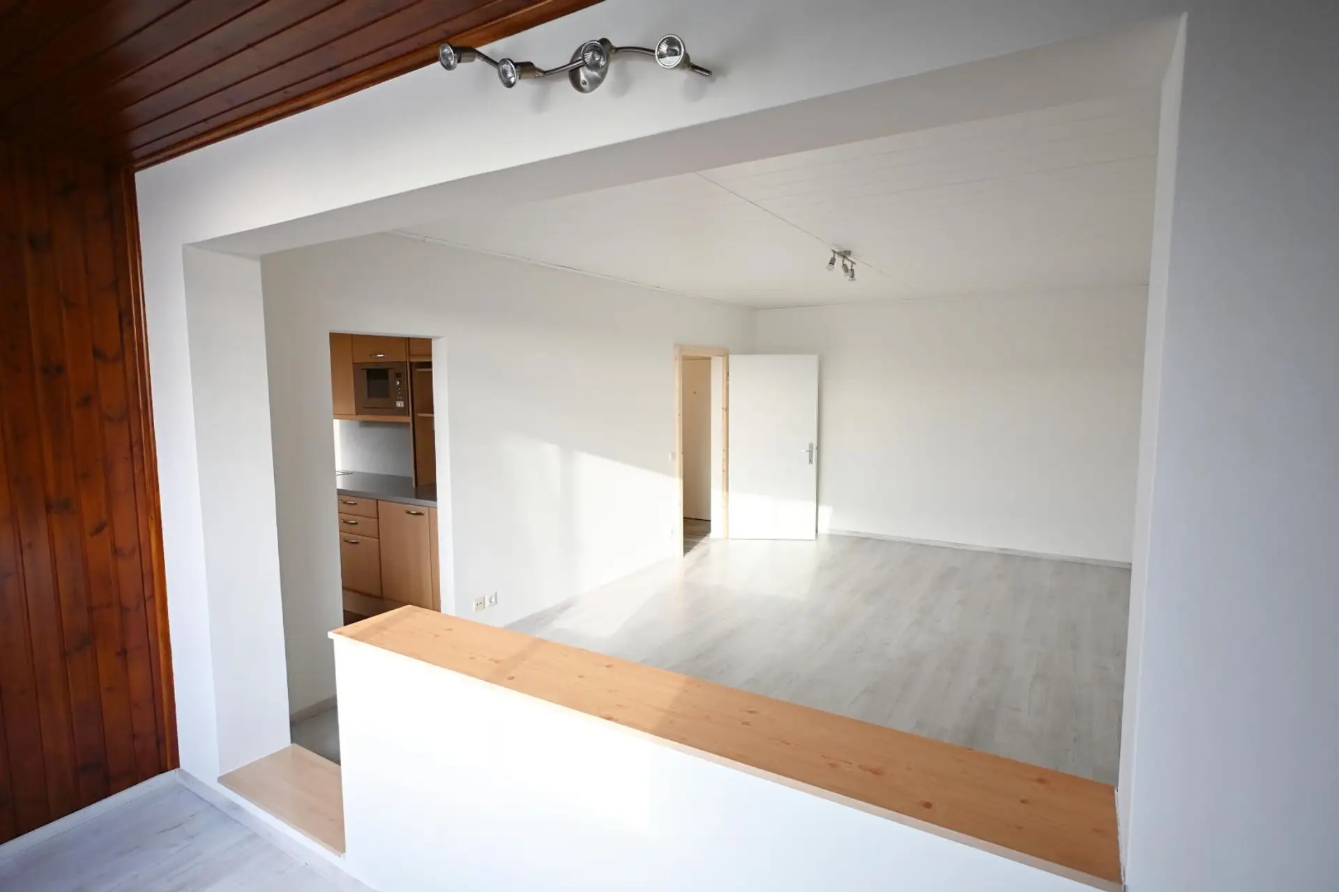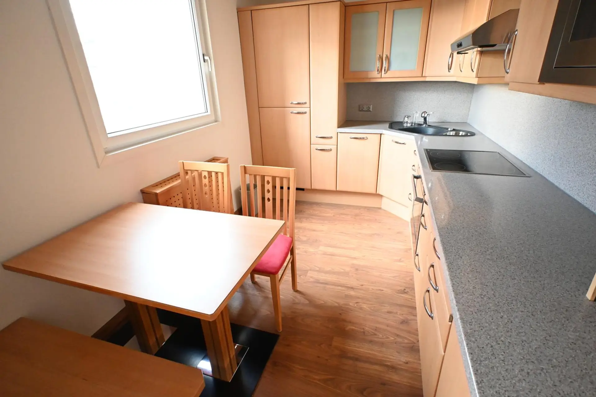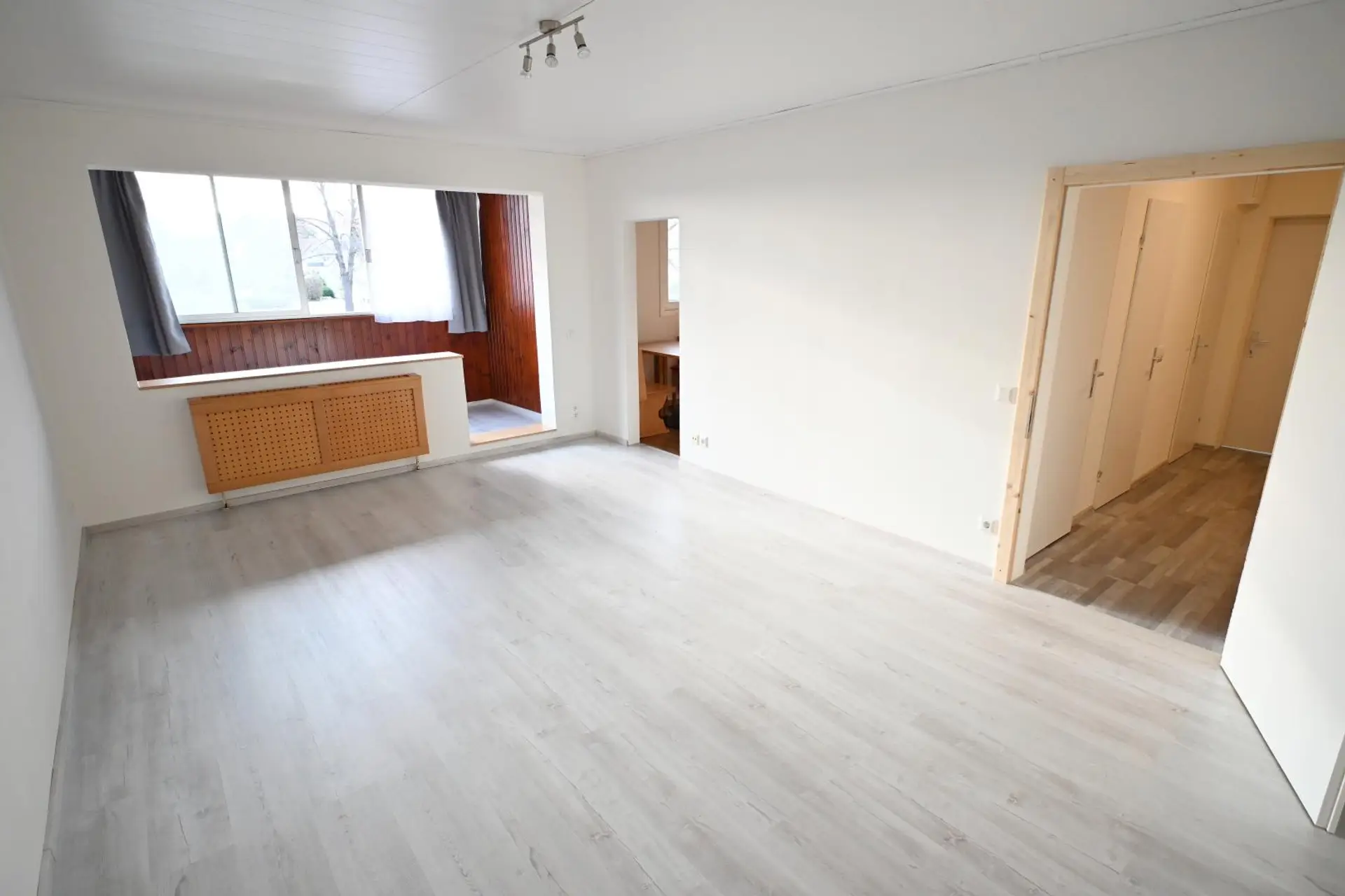 Es gibt ein großes Wohnzimmer, in das die verbaute Loggia integriert wurde, einen weiteren zentral begehbaren Wohnraum, eine komplett eingerichtete Küche (DAN) mit Essbereich inklusive Geräten und Waschmaschinenanschluss und über den Vorraum sind das Badezimmer, das separate WC sowie ein Abstellraum erreichbar. Sämtliche Fenster sowie auch die Loggia sind nach Westen ausgerichtet. Ein KFZ-Stellplatz ist bereits inkludiert!