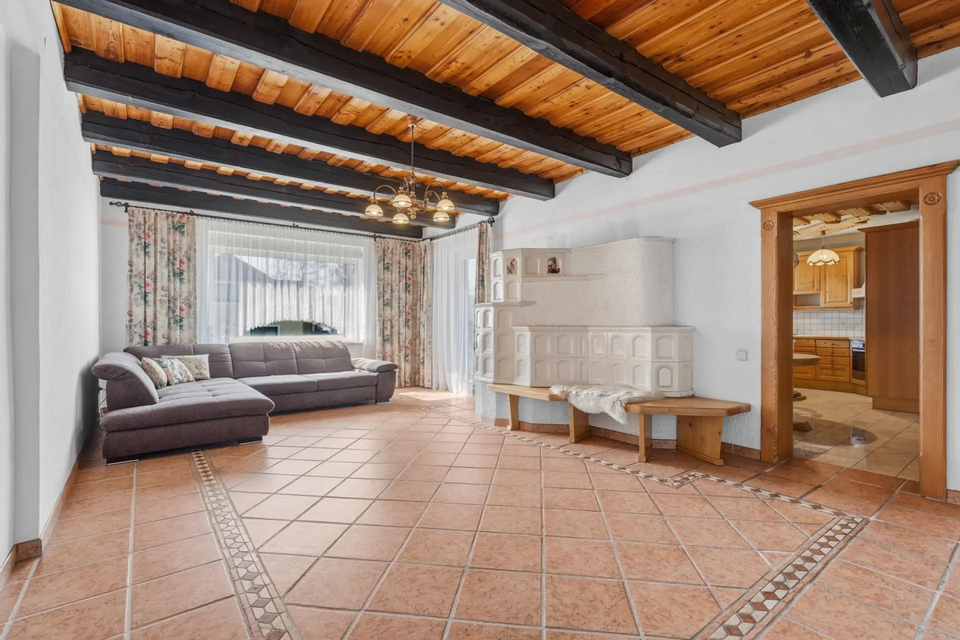 Die Kunststofffenster haben Doppelverglasung und großteils Außenläden. Es gibt zwei Bäder (und fast ein drittes im Keller), eines davon mit Eckbadewanne. Im geräumigen Wohnzimmer (ca. 39 m²) sorgt ein Kachelofen für wohlige Wärme in der Übergangszeit und ansonsten eine Fußbodenheizung, bei der der Heizkessel erst 2019 erneuert wurde.