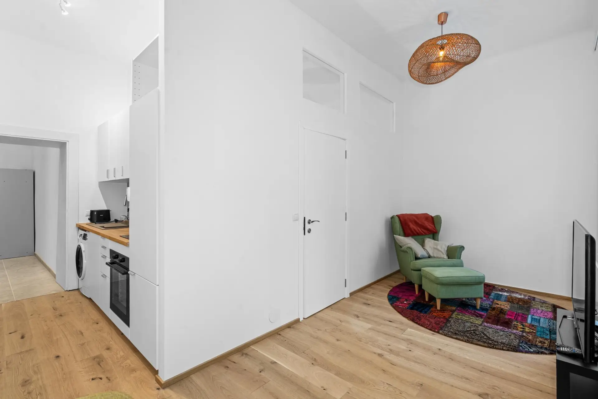 Der offen gestaltete Wohnbereich sorgt für wohlfühl Ambiente. Die Raumaufteilung ist ideal für Singles oder Paare, die es schlicht und praktisch mögen und immer alles griffbereit haben möchten.