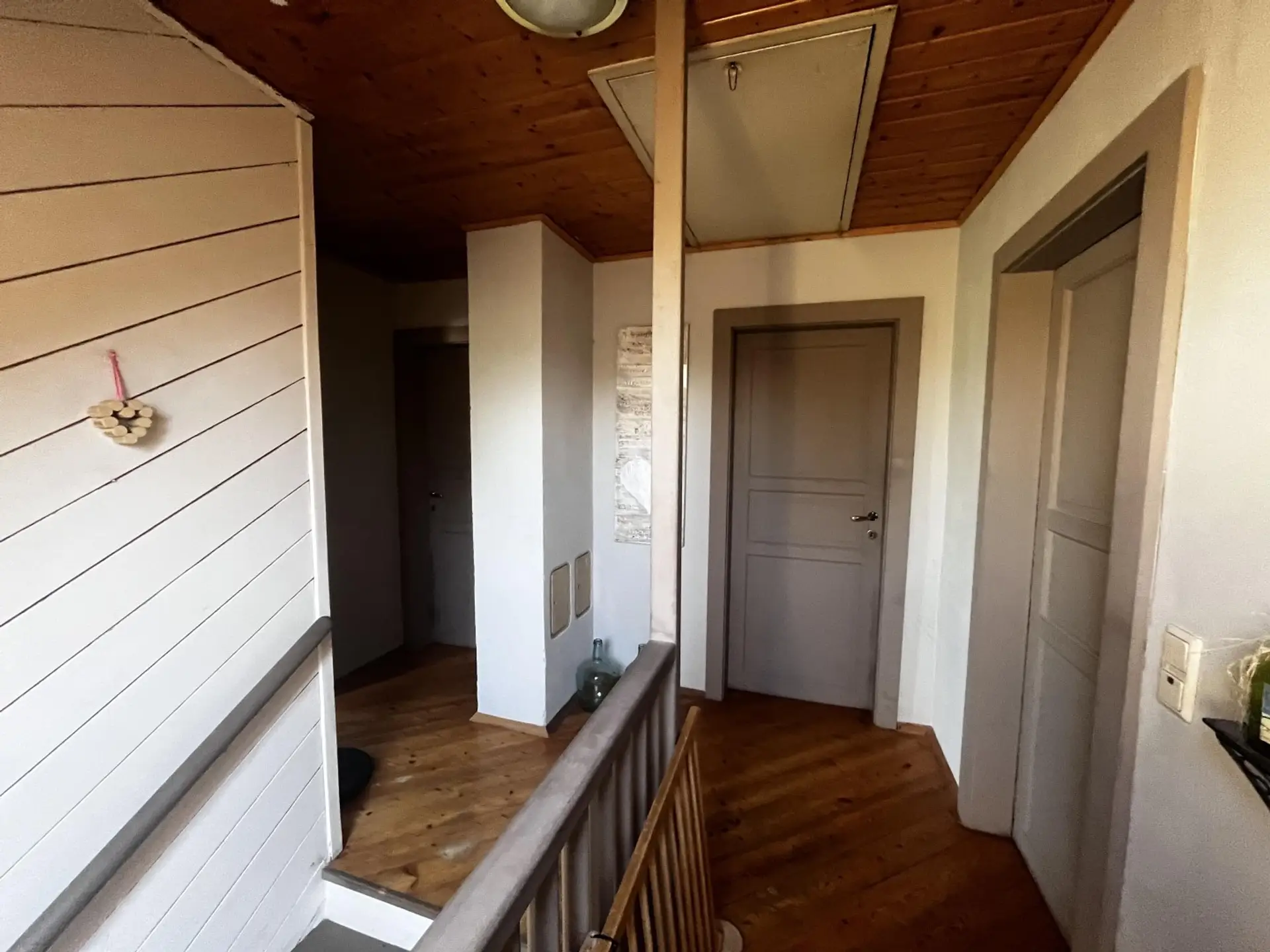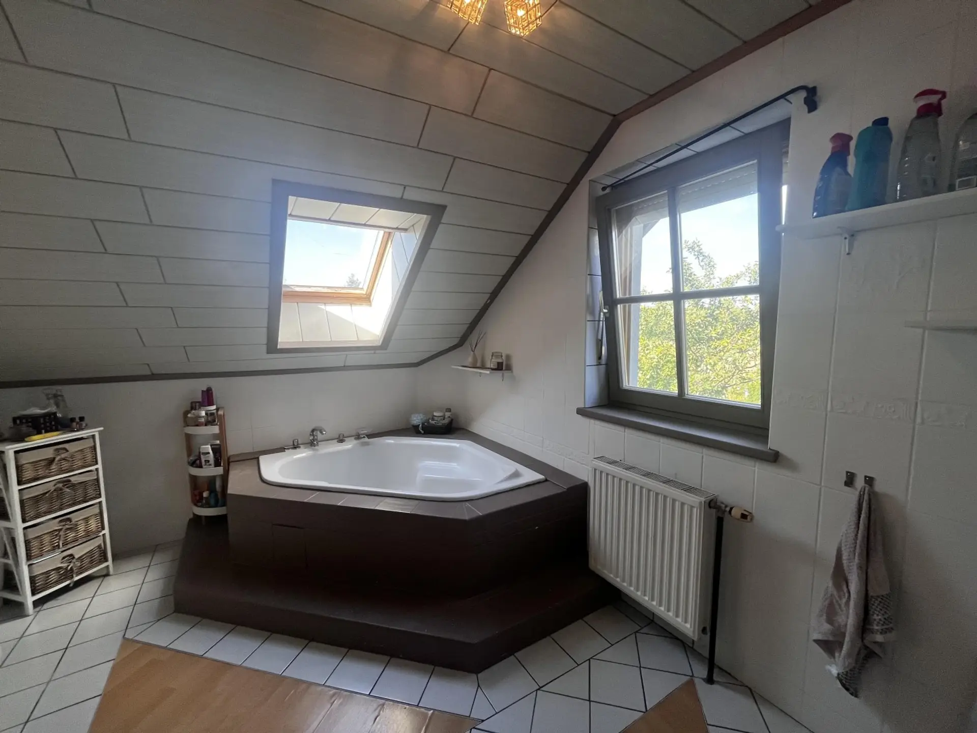 Im Obergeschoss stehen drei Schlafzimmer sowie ein Badezimmer mit Badewanne und separater Toilette zur Verfügung. Große Fenster lassen viel Tageslicht herein und bieten einen schönen Ausblick auf die Umgebung.
