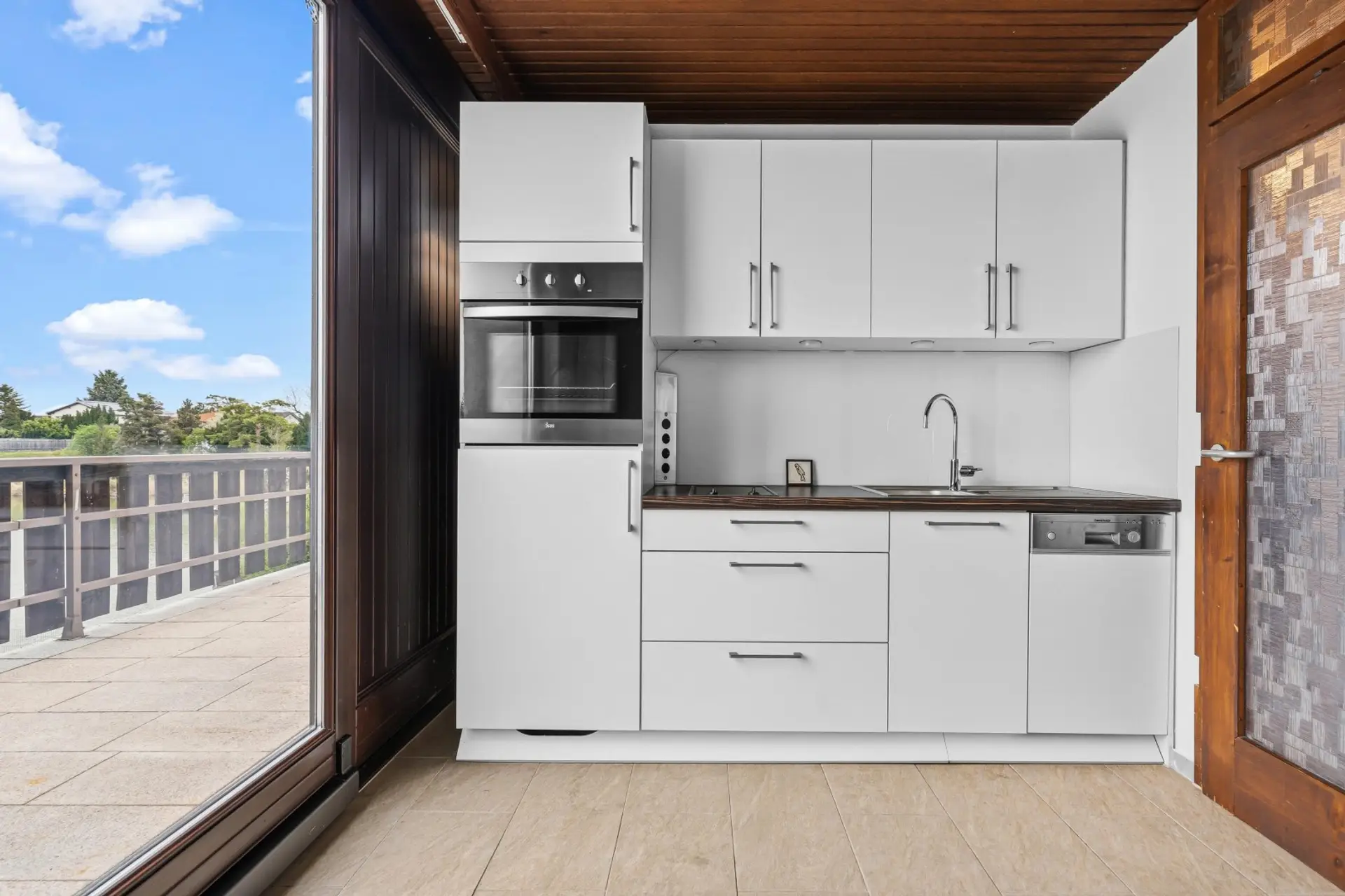 In der oberen Wohnetage finden Sie Bad, WC, voll ausgestattete Küche sowie Ess-und Wohnzimmer mit Ausgang zur ost-südostseitig ausgerichteten Terrasse und herrlichem Blick auf`s beruhigende Wasser.