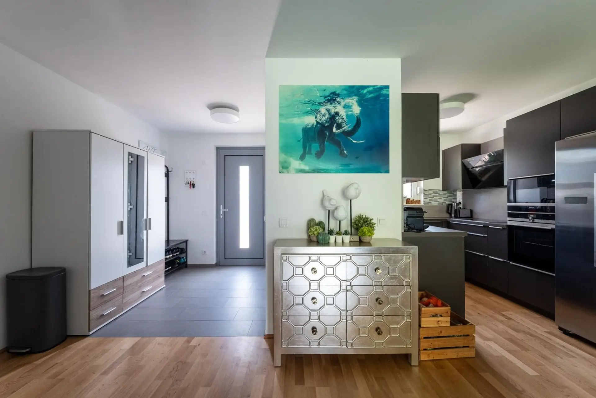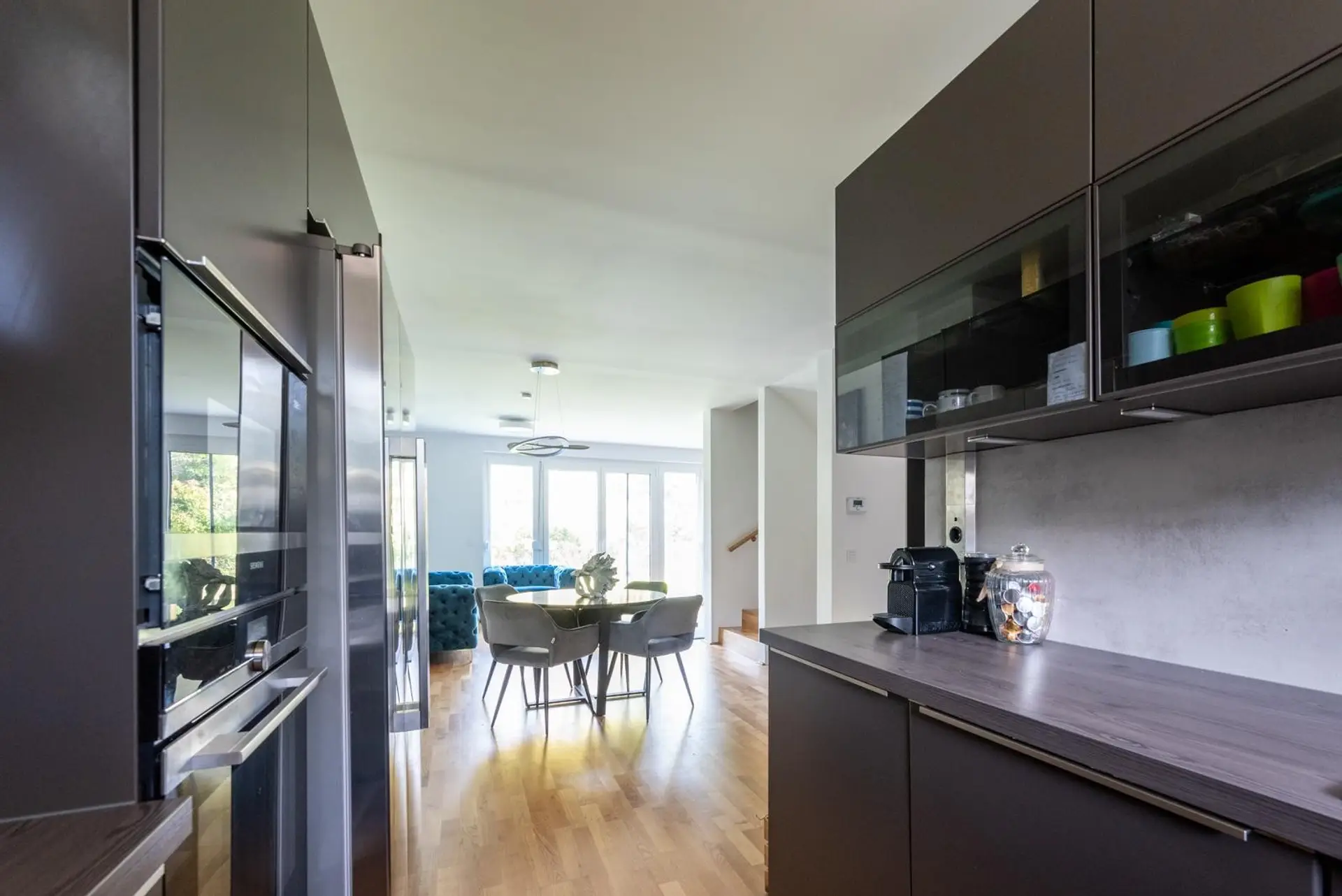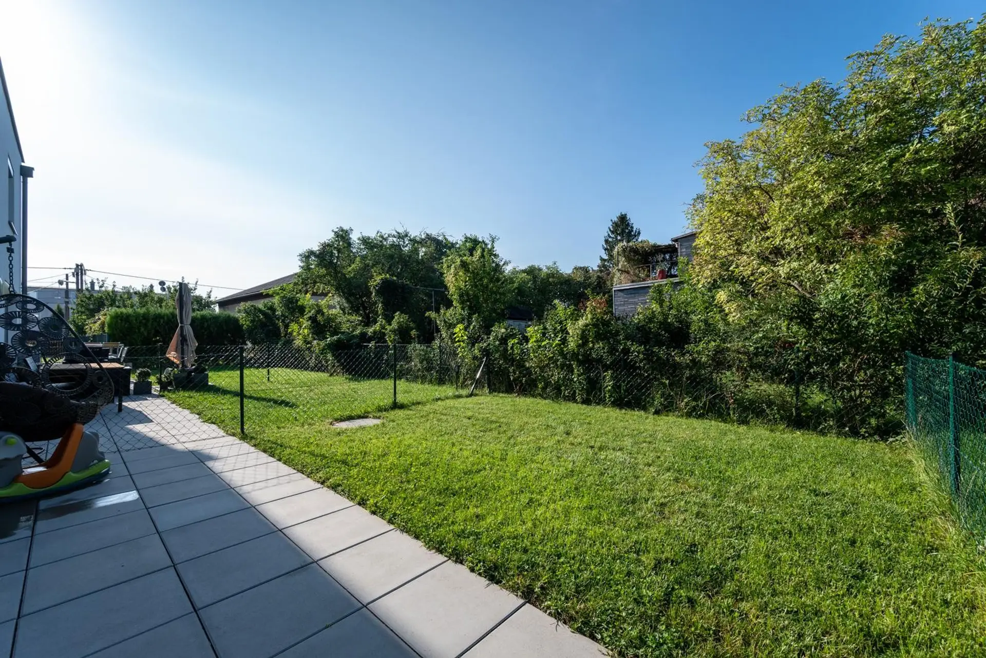 Erdgeschoss: Vorzimmer, separates WC, Küche mit allen Einbaugeräten, Esszimmer, Wohnzimmer mit Zugang zur Terrasse und zum Südwest-ausgerichteten Garten - ideal für Barbecues und Sonnenbäder.