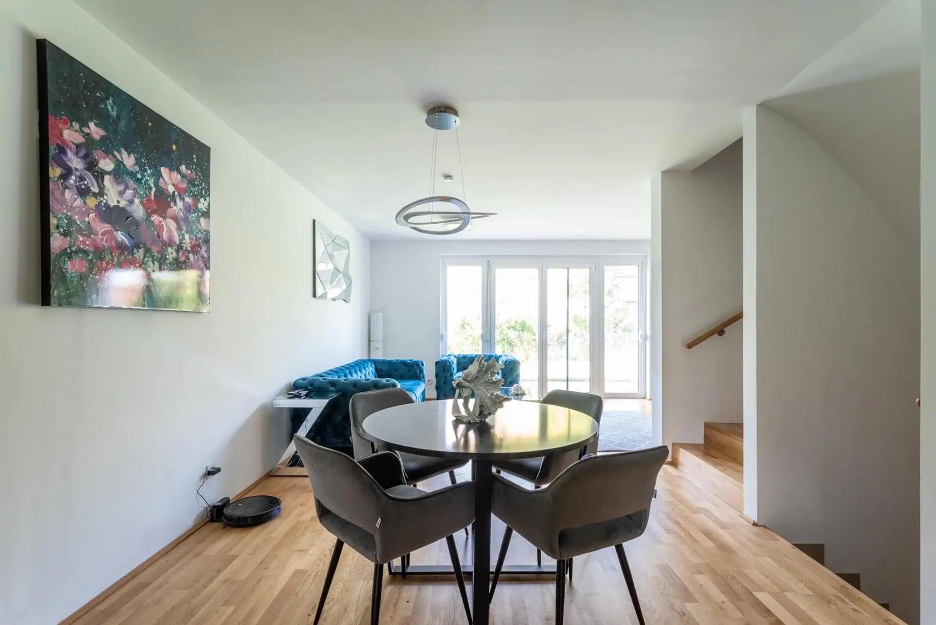 Ground floor: Entrance hall, separate toilet, kitchen with all built-in appliances, dining room, living room with access to the terrace and southwest-facing garden - ideal for barbecues and sunbathing.