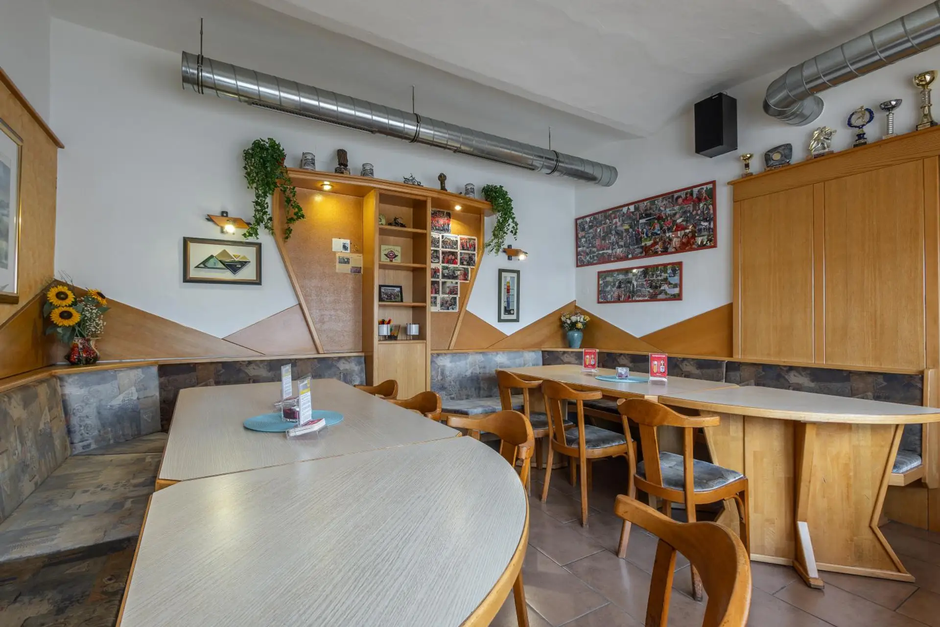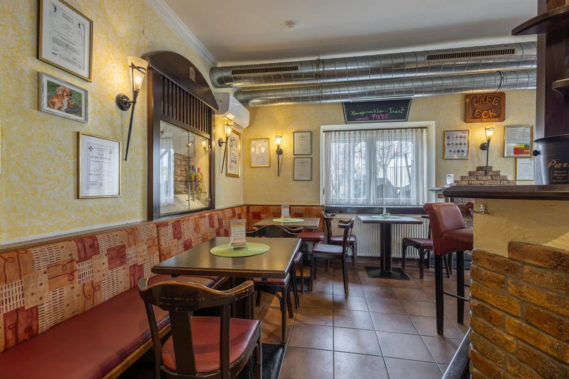 * Stehtische und Sitzplätze im Gastroraum mit Theke