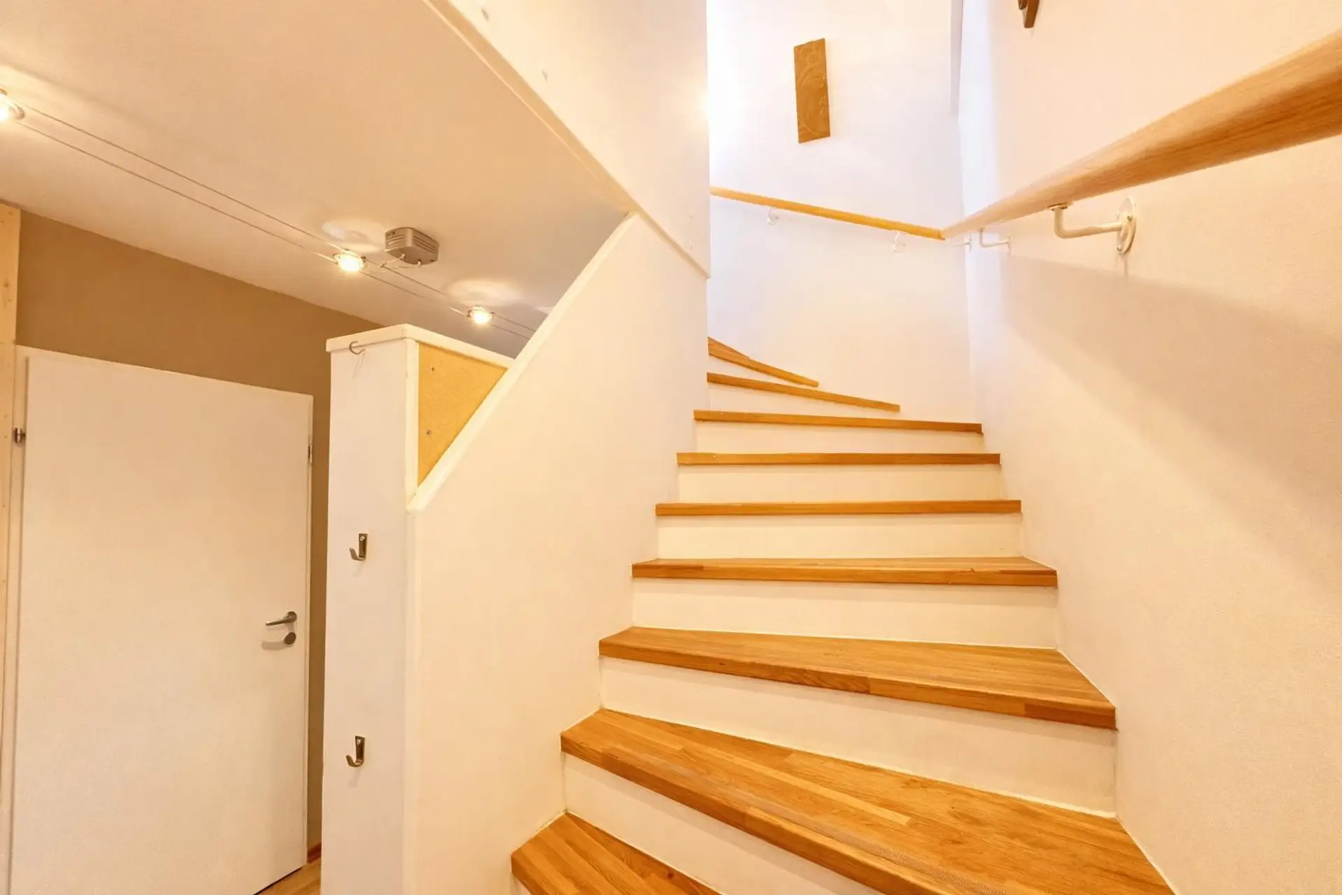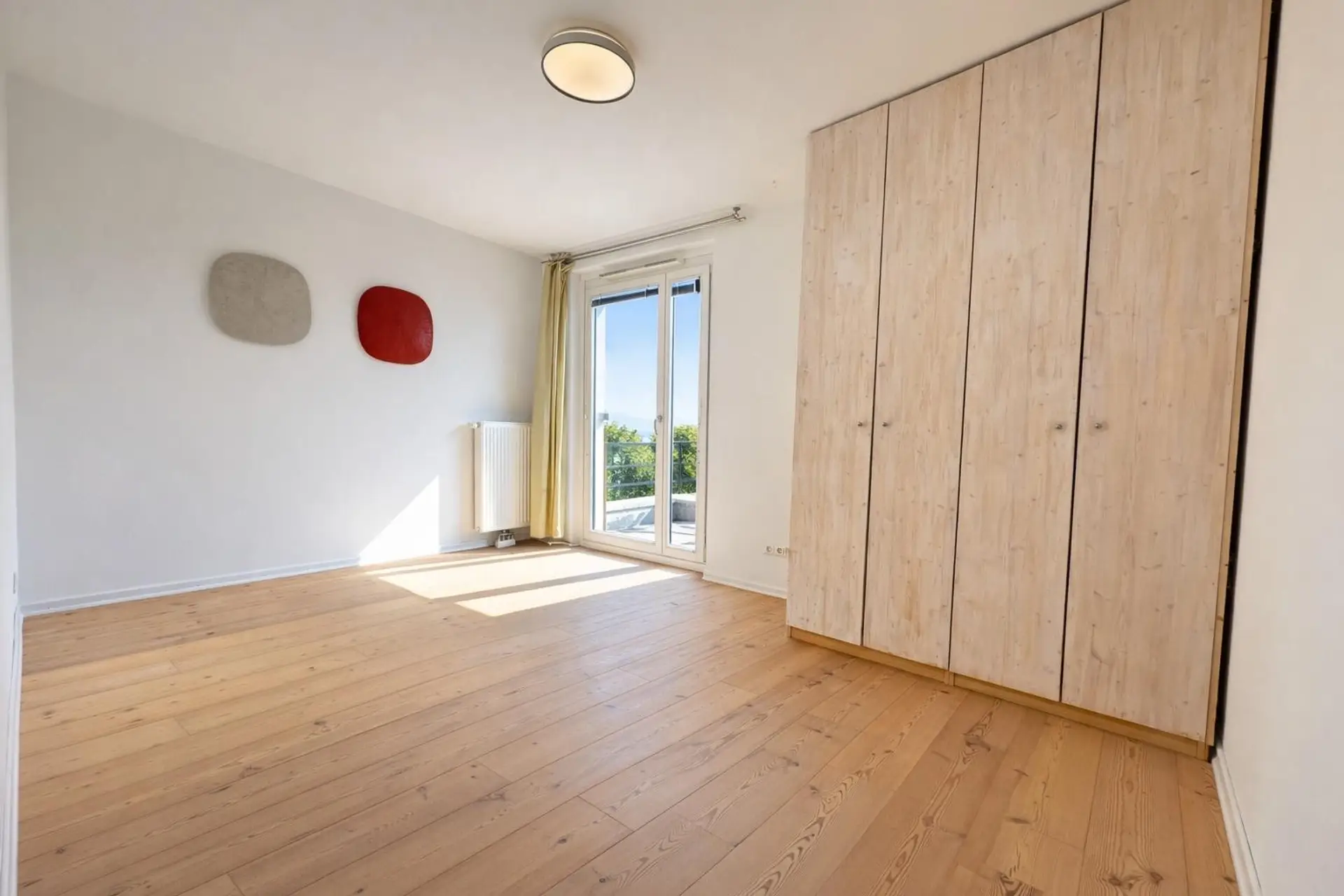 Über eine stilvolle Holztreppe gelangen Sie in das obere Stockwerk, das drei helle Schlafzimmer umfasst – alle mit französischen Balkonen und großzügigen Fensterfronten, die für ein angenehmes Raumgefühl sorgen. Auch der zentrale Vorraum auf dieser Etage verfügt über einen französischen Balkon. Das luxuriöse Badezimmer ist mit einer Walk-in-Dusche, einem Doppelwaschbecken und – als besonderes Highlight – einer privaten finnischen Sauna mit Starkstromanschluss ausgestattet. Ein weiteres separates WC mit Handwaschbecken befindet sich ebenfalls im oberen Geschoss.