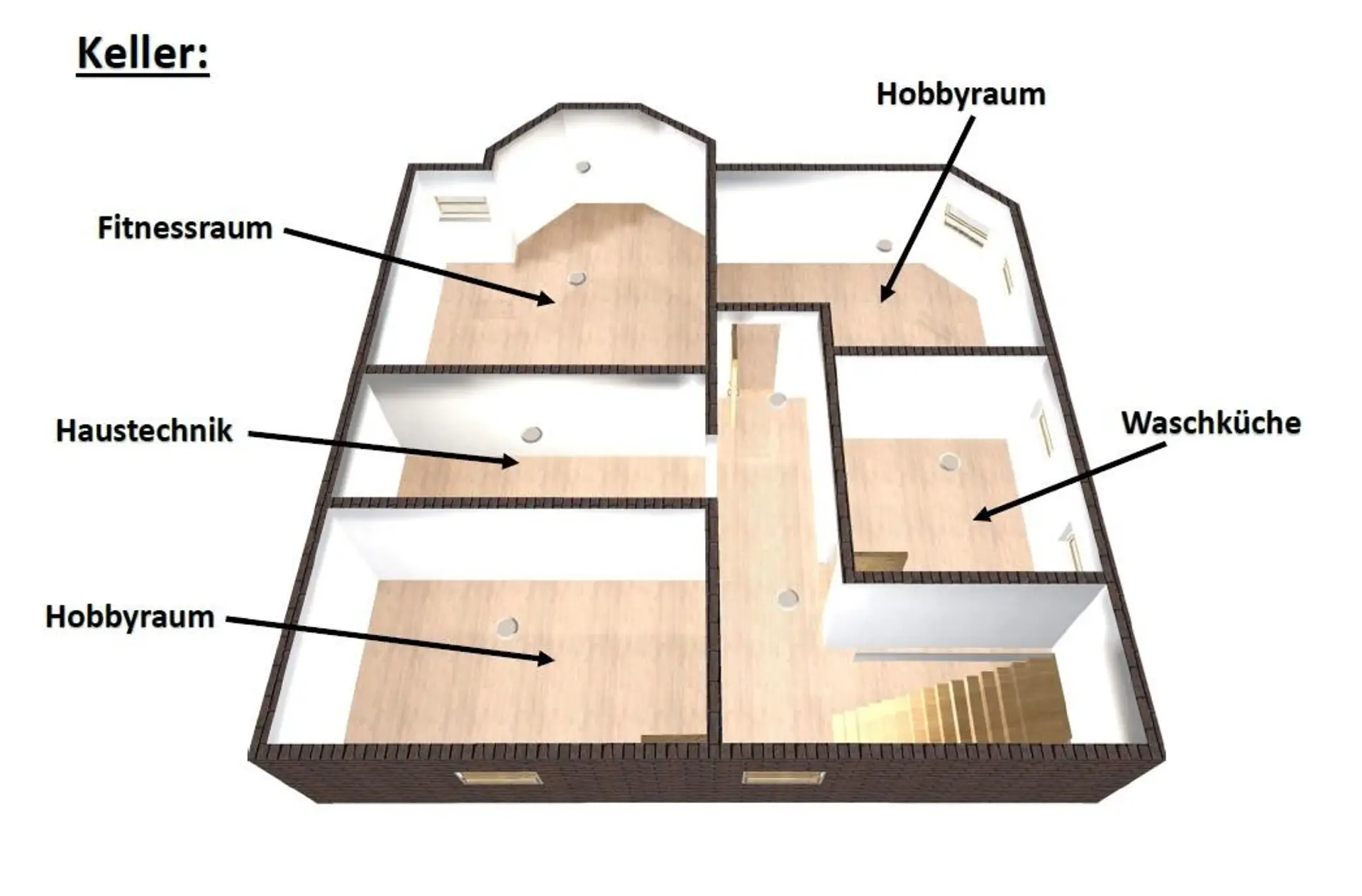 Der vollunterkellerte Keller umfasst ein Fitnessstudio, einen Technikraum, eine Waschküche sowie zwei Hobbyräume.