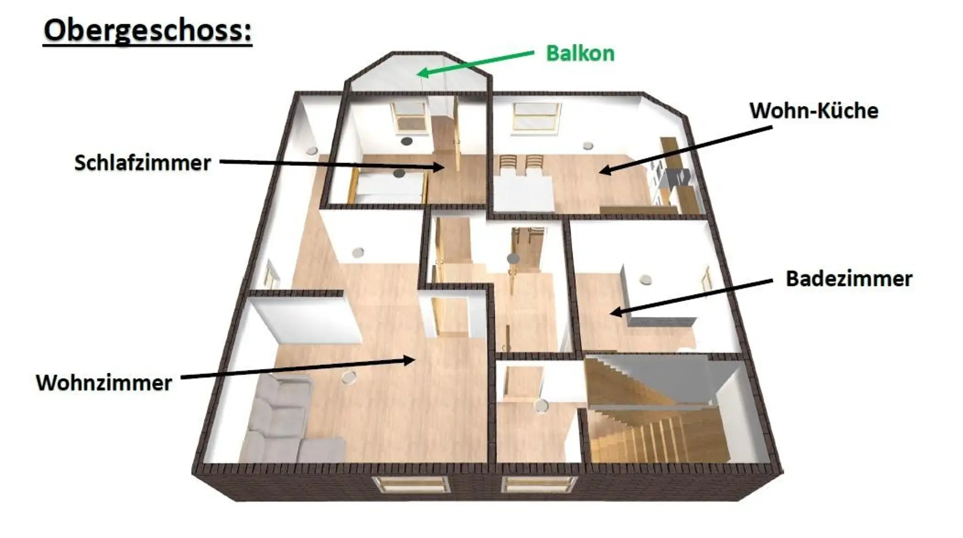 Das Obergeschoss ist über eine Treppe im Vorzimmer erreichbar, und bietet eine geräumige Wohnküche, ein Badezimmer mit Badewanne und Toilette, ein Wohnzimmer mit angrenzendem Schlafzimmer sowie ein weiteres Schlafzimmer mit Zugang zum südseitigen Balkon.