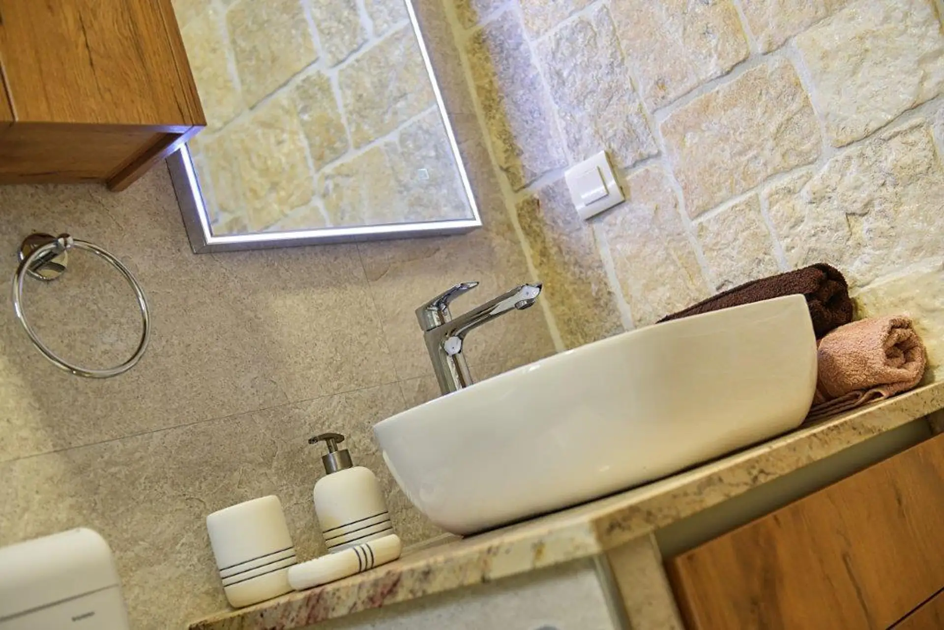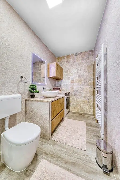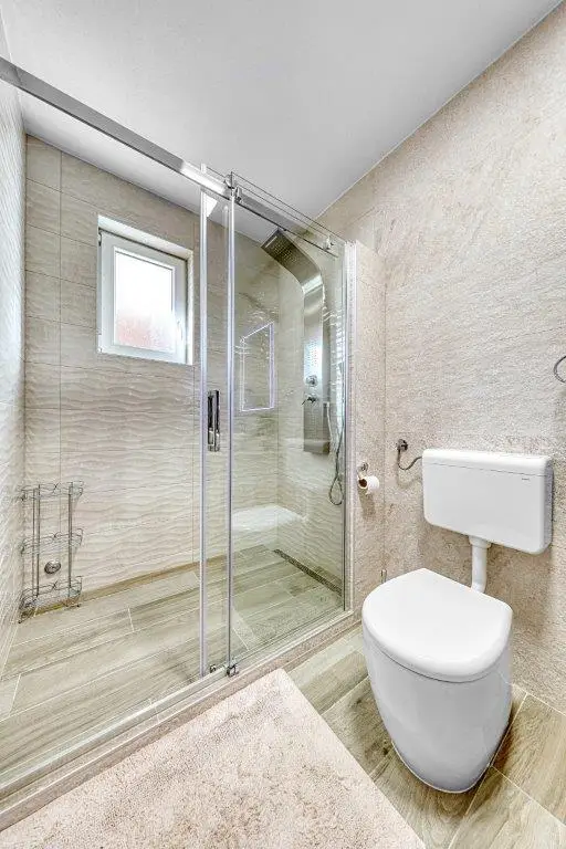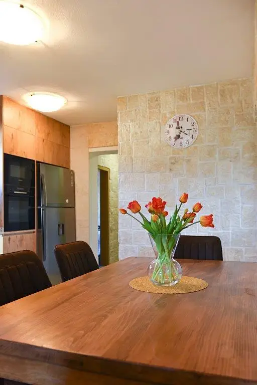 Der Wohnteil des Hauses verfügt über ein großes Wohnzimmer, eine Küche mit Esszimmer, drei Schlafzimmer, zwei Badezimmer mit Toilette und Fußbodenheizung, eine geschlossene Winterloggia, eine große überdachte Terrasse mit Grill, einen Abstellraum im Freien, eine große Garage von 45 m² und einem eigenem Brunnen (gusterna).