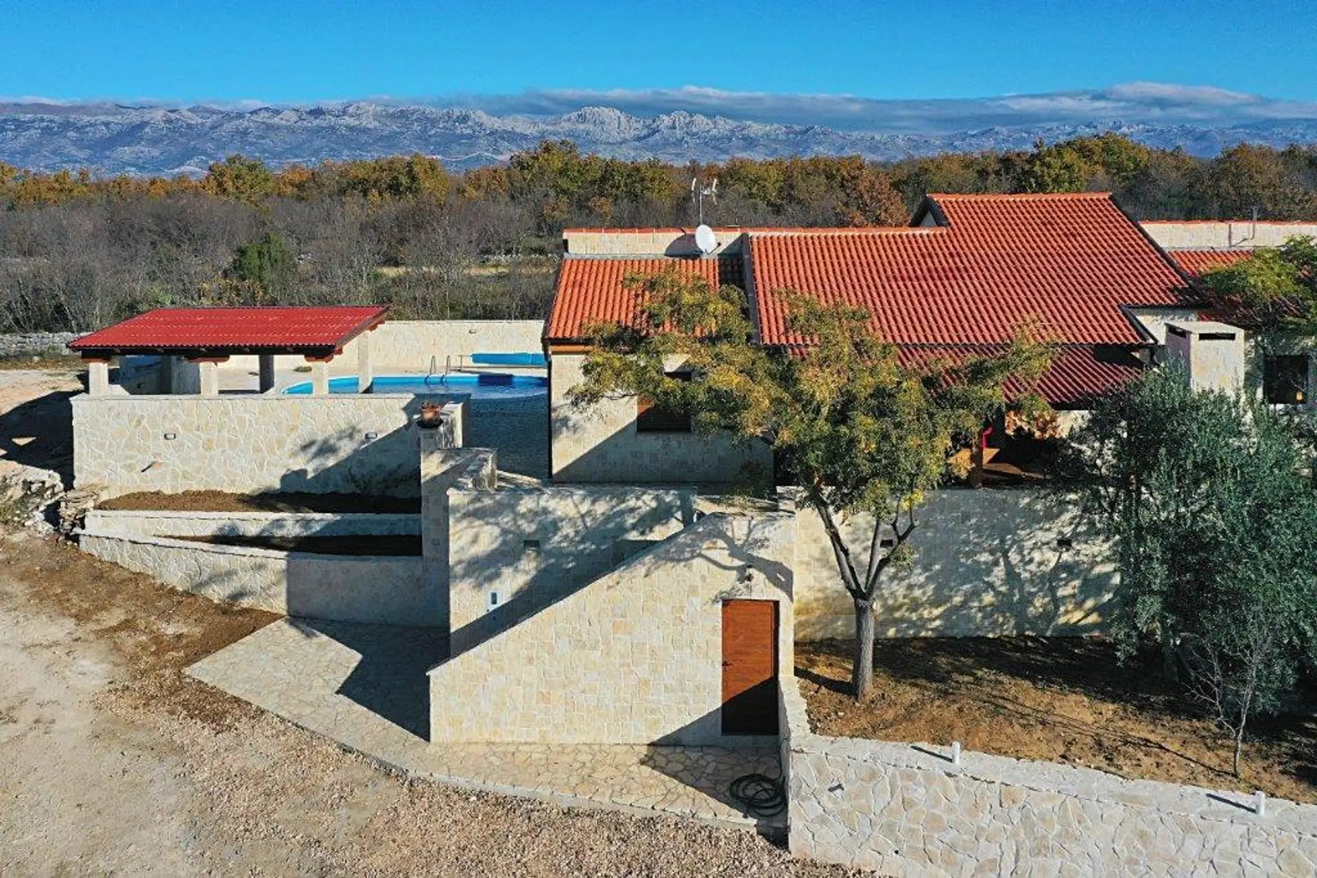 Ideal zum Leben und Entspannen in der Natur, umgeben von viel Grün und Olivenbäumen, mit einem wunderschönen Panoramablick auf den Velebit.