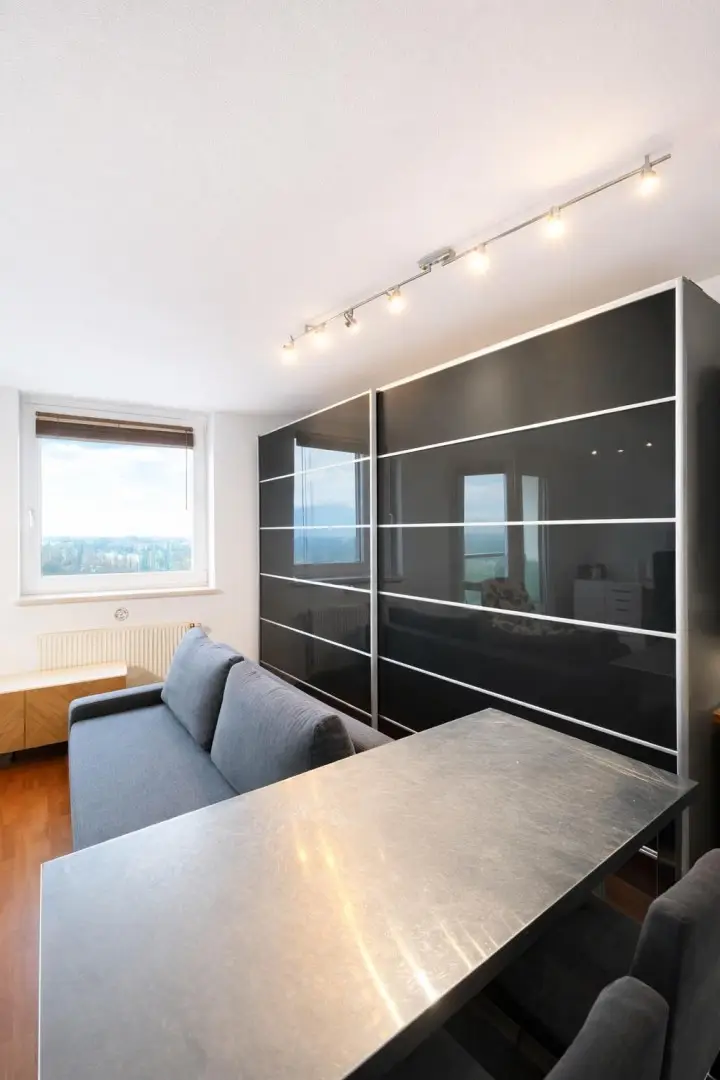 Die Ausstattung umfasst eine Einbauküche, Laminat- und Fliesenböden, Fernwärme, Lift, Concierge-/Portierservice sowie Barrierefreiheit. Die Wohnung befindet sich in sehr gutem/gutem Zustand und kann auf Wunsch teil- oder vollmöbliert angemietet werden. Im Haus stehen ein absperrbarer Fahrradraum sowie eine großzügige „Sky Lobby“ bzw. ein Partyraum zur Nutzung zur Verfügung. Garagenplätze können zusätzlich angemietet werden.