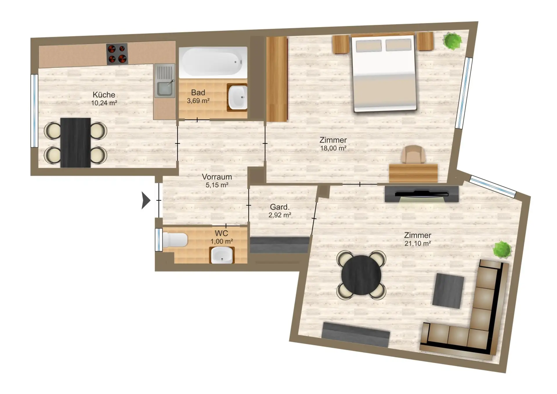 Durch die Raumaufteilung mit zwei fast ident großen Zimmern, extra grozügiger Küche als Aufenthalstraum, Bad und WC gretrennt, ist die Wohnung perfekt als WG-Wohnung nutzbar.