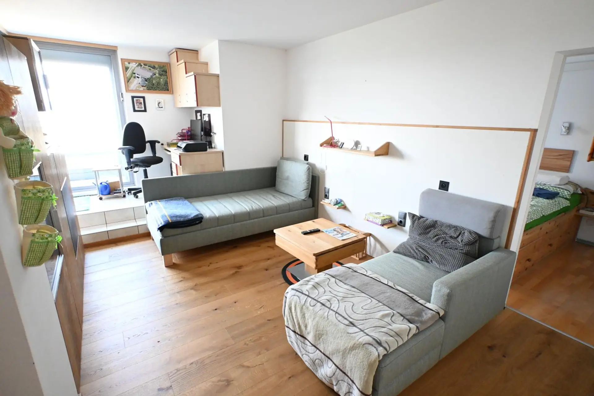 Es stehen zwei Wohnräume sowie eine Küche (voll ausgestattet inklusive Geräte) mit Essbereich zur Verfügung, weiters ein Badezimmer (mit Fenster) mit großzügiger Dusche (inklusive Infrarotstrahler) und Waschmaschinenanschluss, ein separates WC und ein großer Abstellraum mit Stromanschluss (zB. für einen Kühlschrank). Sämtliche Räume sind nach Westen ausgerichtet und bieten eine wunderbare Fernsicht. Im größeren Wohnraum sowie in der Küche gibt es jeweils einen Ausgang zur Terrasse, von der man ebenfalls die Aussicht ins Grüne und über die Stadt genießen kann. Es gibt eine Klimaanlage sowie elektrische Außenjalousien und kontrollierte Raumbelüftung.