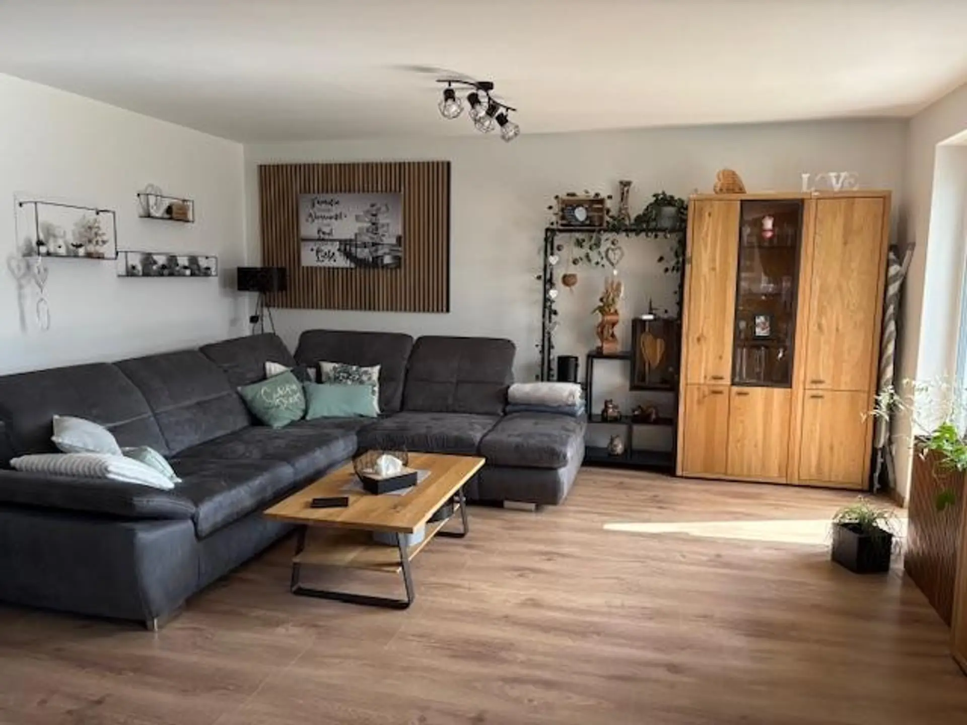 Die Fenster sind 3-fach verglast mit teilweisem Fliegengitter und auf der Südseite sind auch noch Außenjalousien mit Fernbedienung. Im ganzen Haus ist Fußbodenheizung. Durch die große Terrassentüre gelangen Sie in den südseitigen Garten. Die Terrasse ist mit Überdachung und Windschutz ausgestattet. Die Gartengeräte finden genug Platz in der Gartenhütte. Der Garten hat eine Fläche von 153,32 m² und die Wohnfläche beträgt 118,53 m².