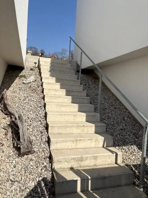 Links von der Terrasse führen Stiegen zum Parkplatz direkt vor dem Haus.