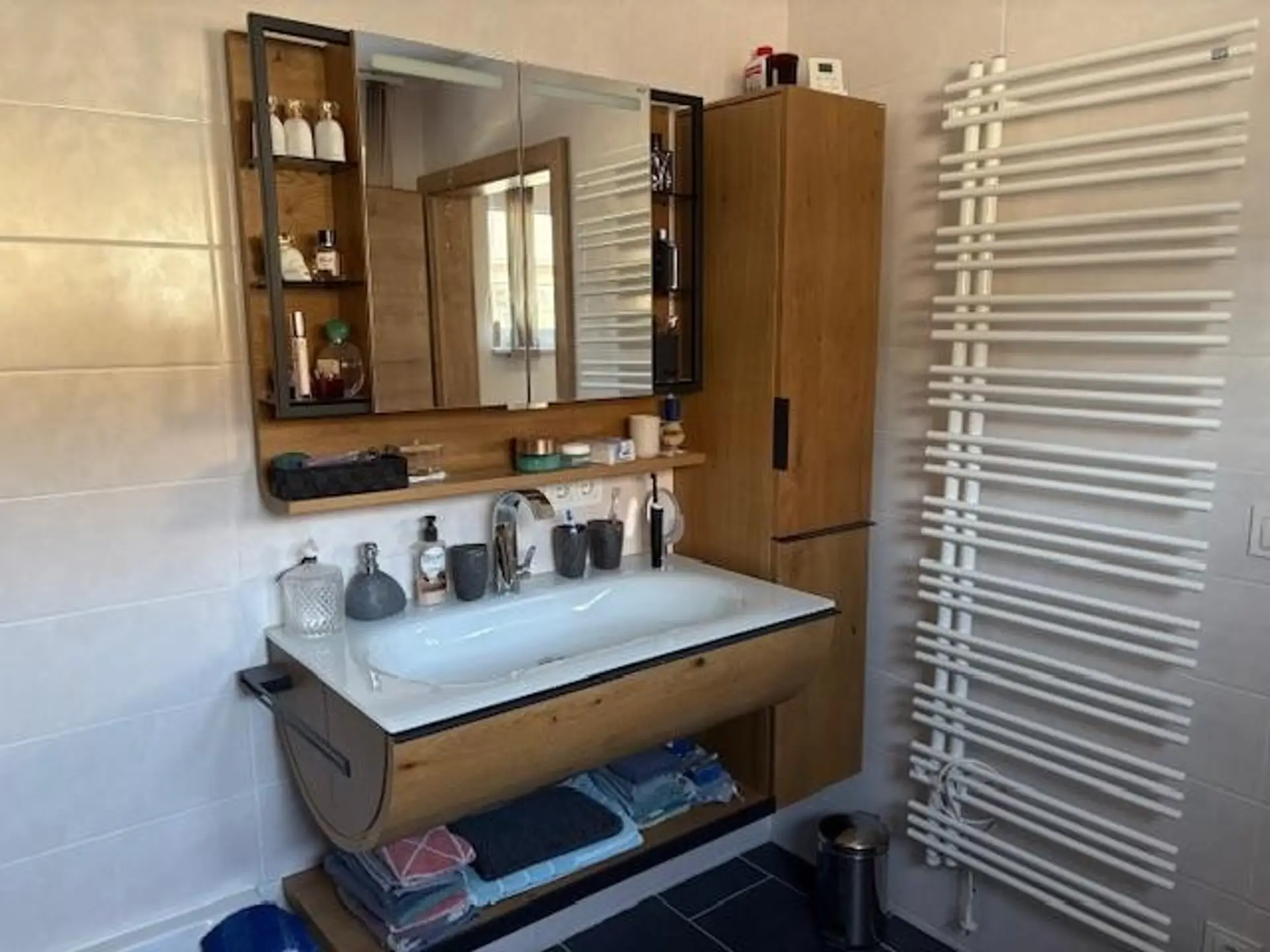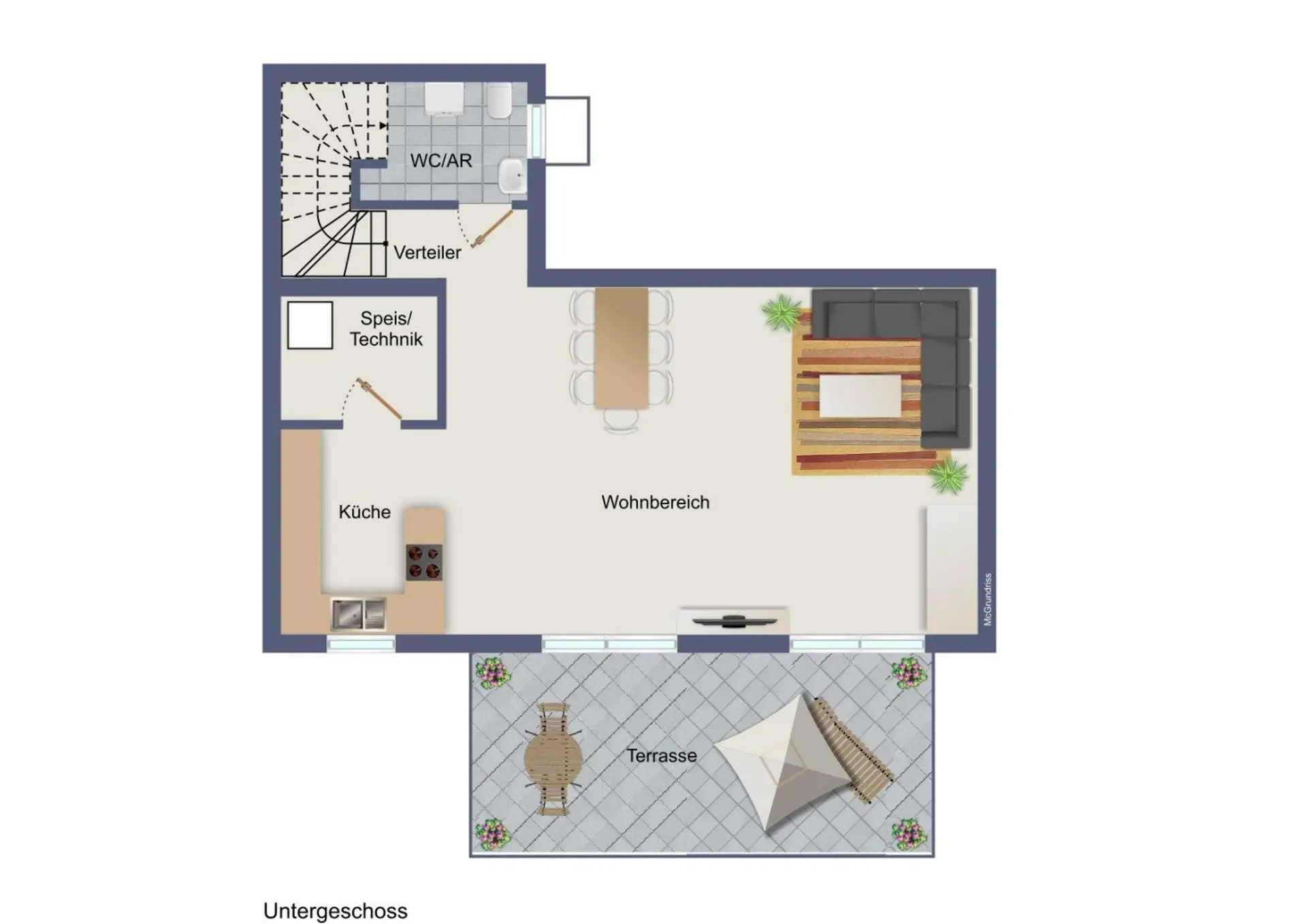 Mit den bequemen Stiegen gelangen sie ins Untergeschoß. Das offene Wohn-Esszimmer mit Küche ist sehr hell und sehr geräumig. Die Küche ist mit allen Einbaugeräten ausgestattet. Gleich neben der Küche befindet sich der Technikraum mit Viessmann Wärmepumpe. Der Raum ist groß genug, um noch einige Regale hier unterzubringen. In dieser Ebene wurde auch noch ein Abstellraum mit WC und Waschtisch und Waschmaschinen Anschluss eingerichtet.
