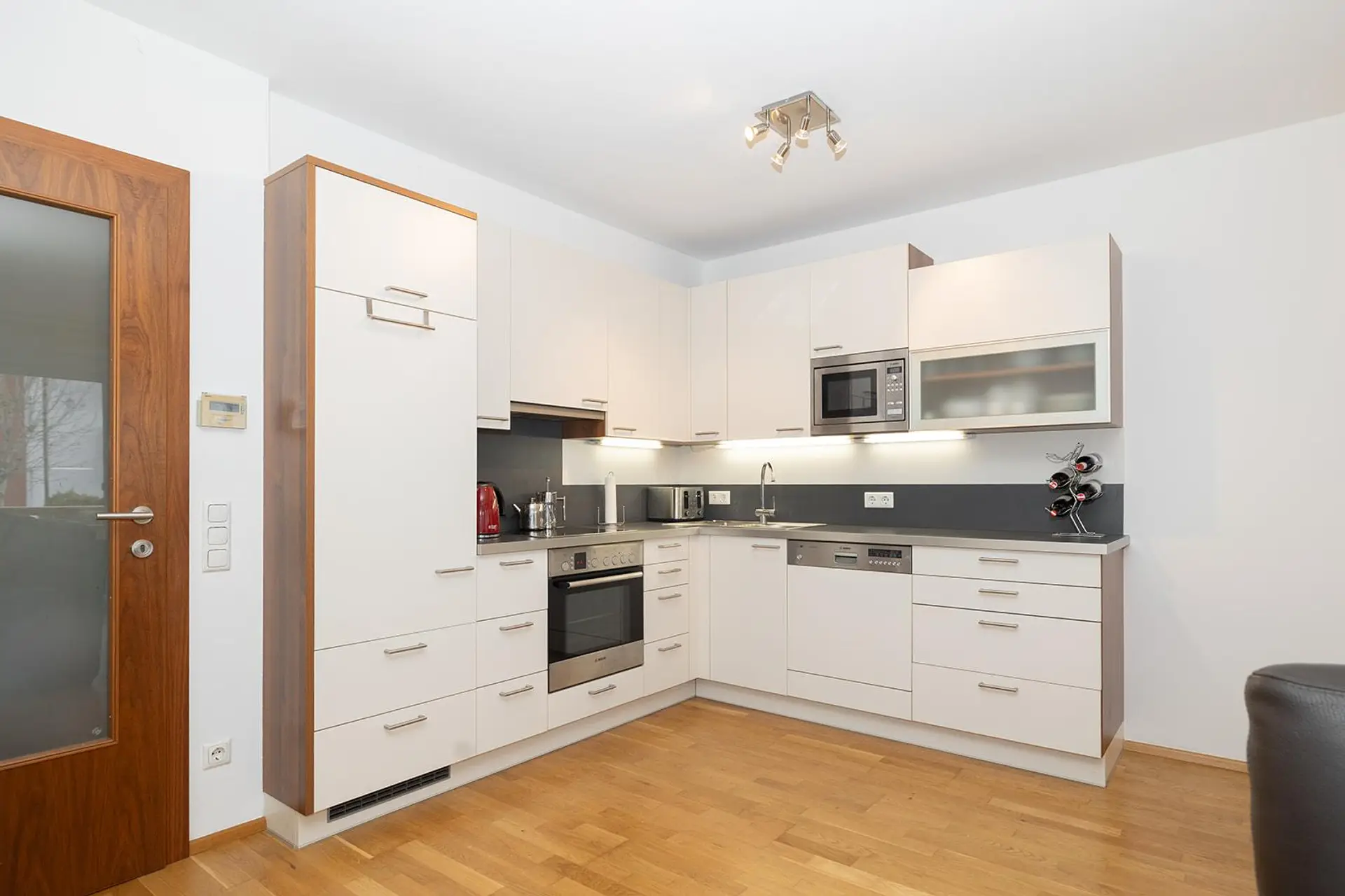 Das Herzstück der Wohnung ist der helle Wohn- und Essbereich mit integrierter Küche – offen, freundlich und ideal für gesellige Stunden mit Familie und Freunden. Der stilvolle Schwedenofen sorgt an kühlen Tagen für wohlige Wärme und eine besonders behagliche Atmosphäre.