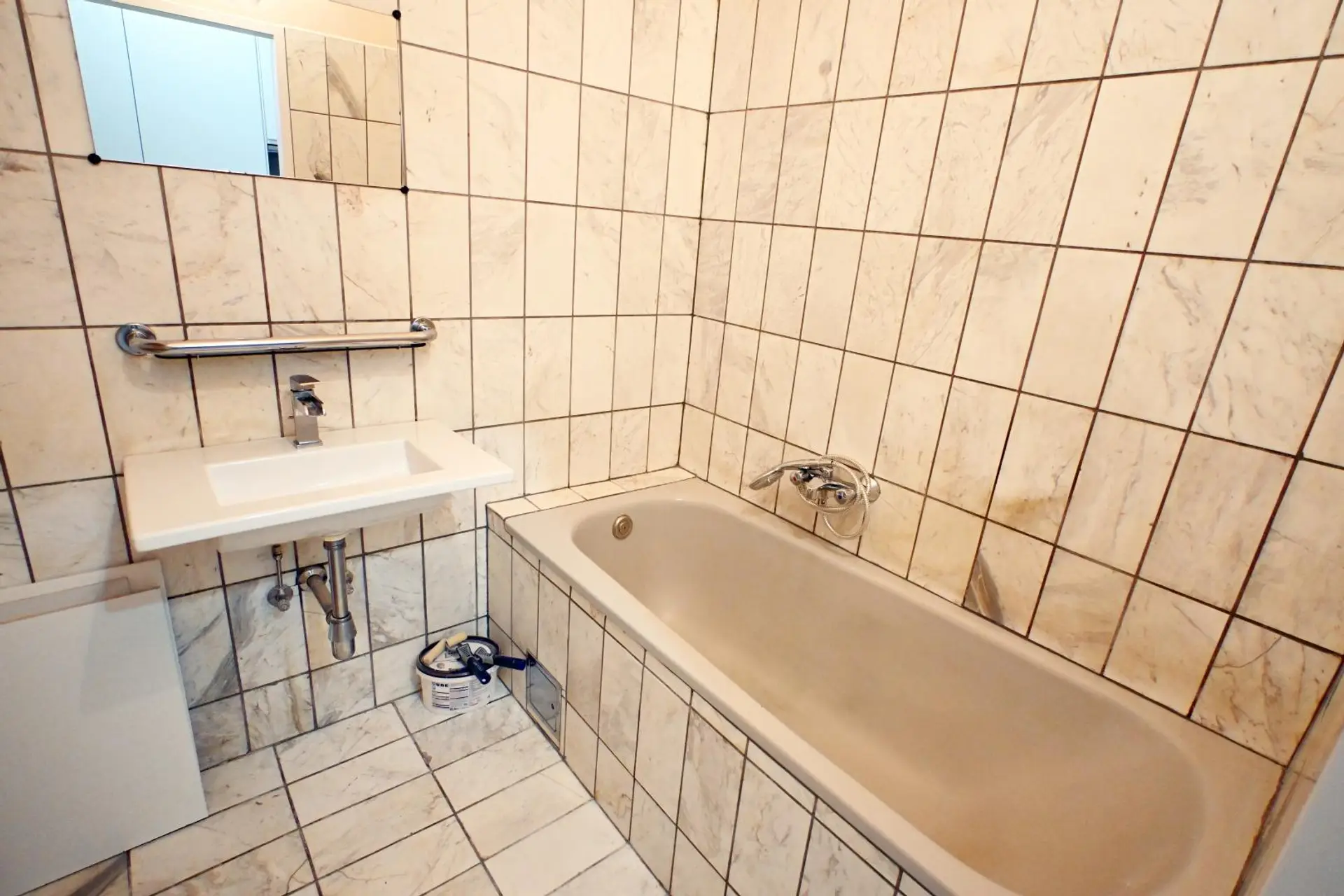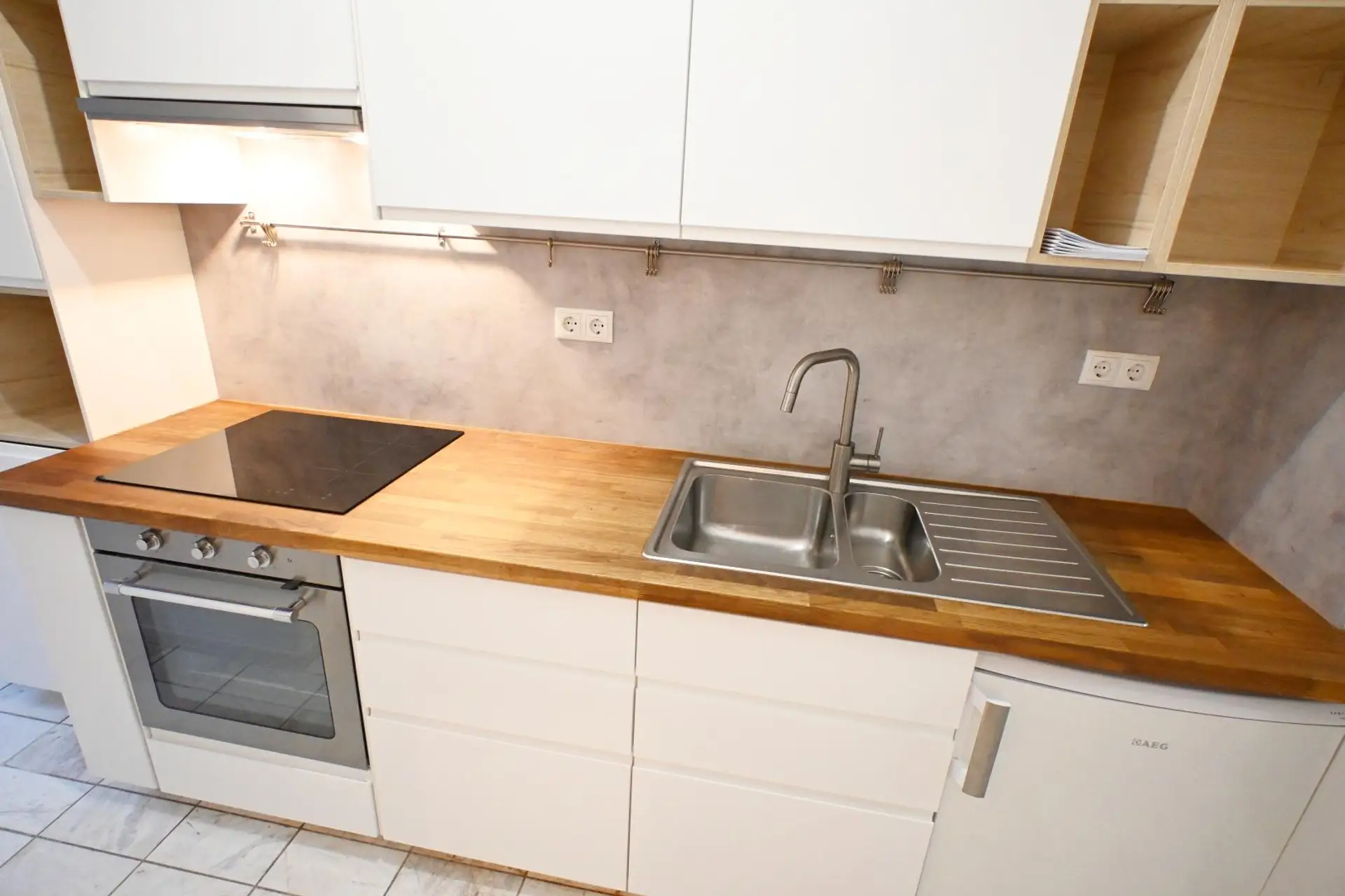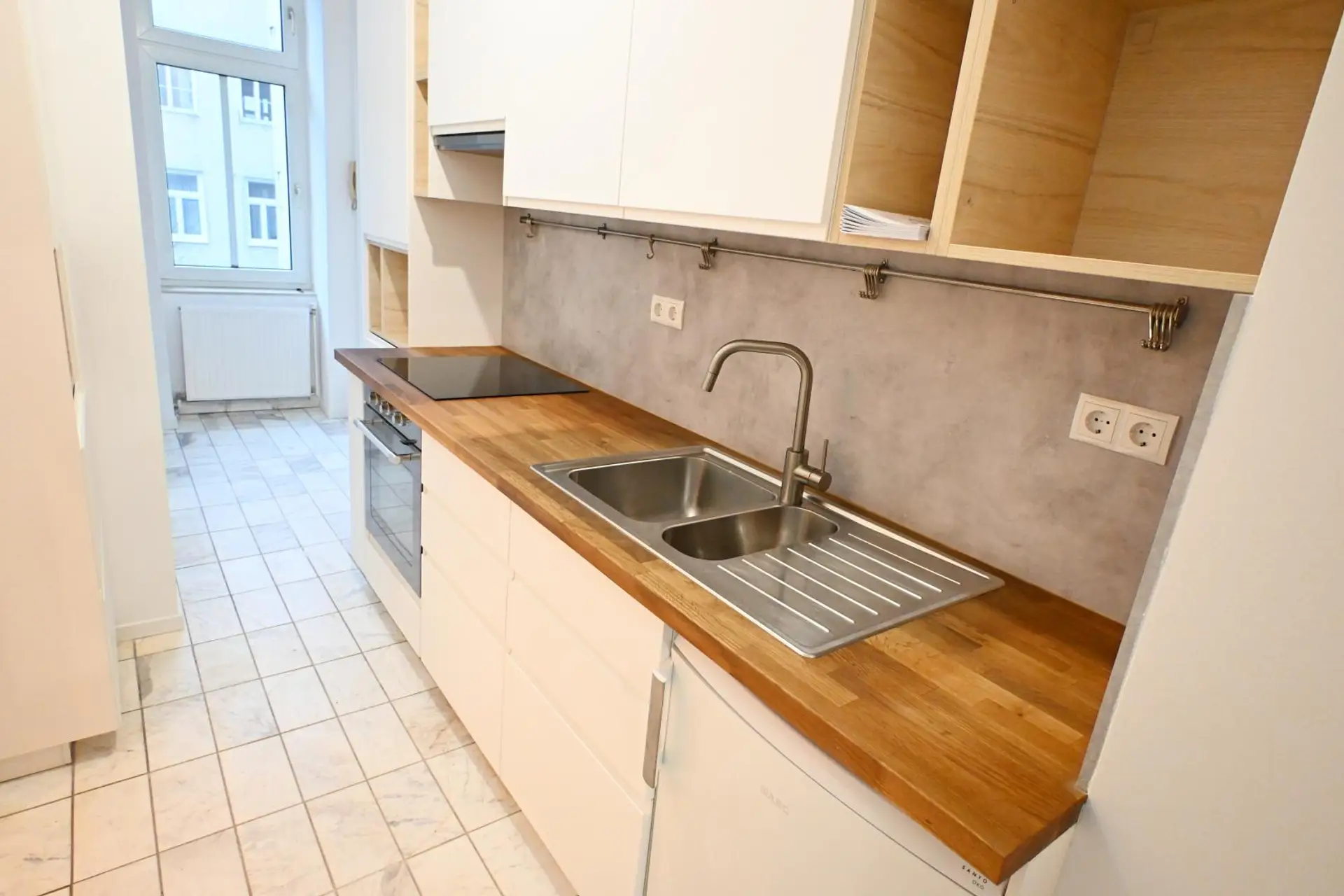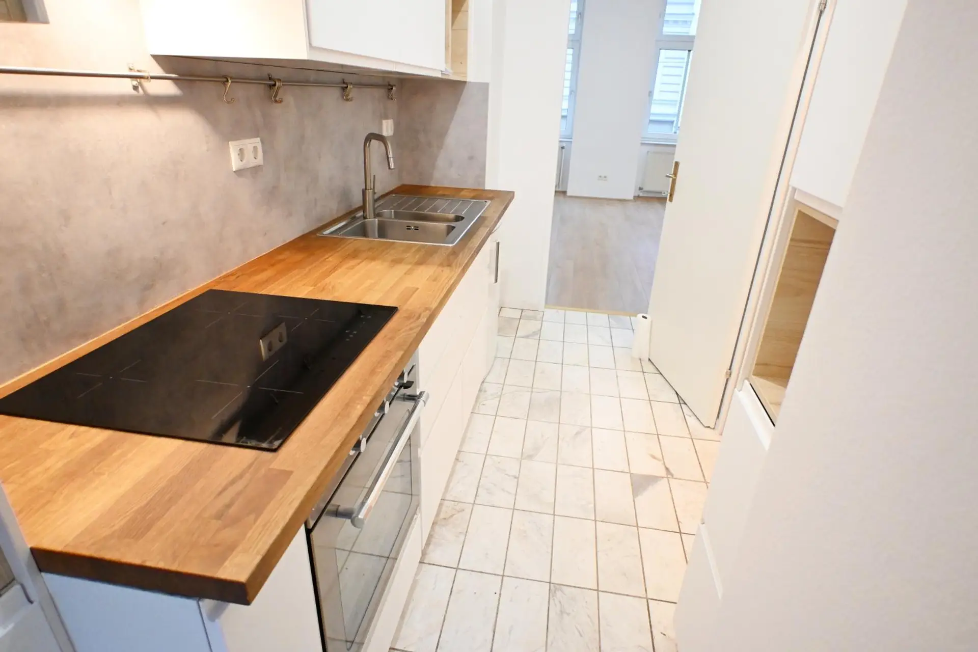 Im Vorraum befindet sich die sehr gepflegte und teilweise neuwertige (Herd/Ofen) Küche (ca. 7,86 m²) in der sich auch der Waschmaschinenanschluss und die Gastherme befinden. Über die Küche ist das Wohnzimmer zu erreichen (ca. 18m², Richtung Südost zur Vogelsanggasse), sowie ein weiterer kleiner Wohnraum/Kabinett (ca. 5,23m²) und das Badezimmer/WC (ca. 3,88 m²). Die Fenster des Kabinetts sowie der Küche sind in den Innenhof ausgerichtet.