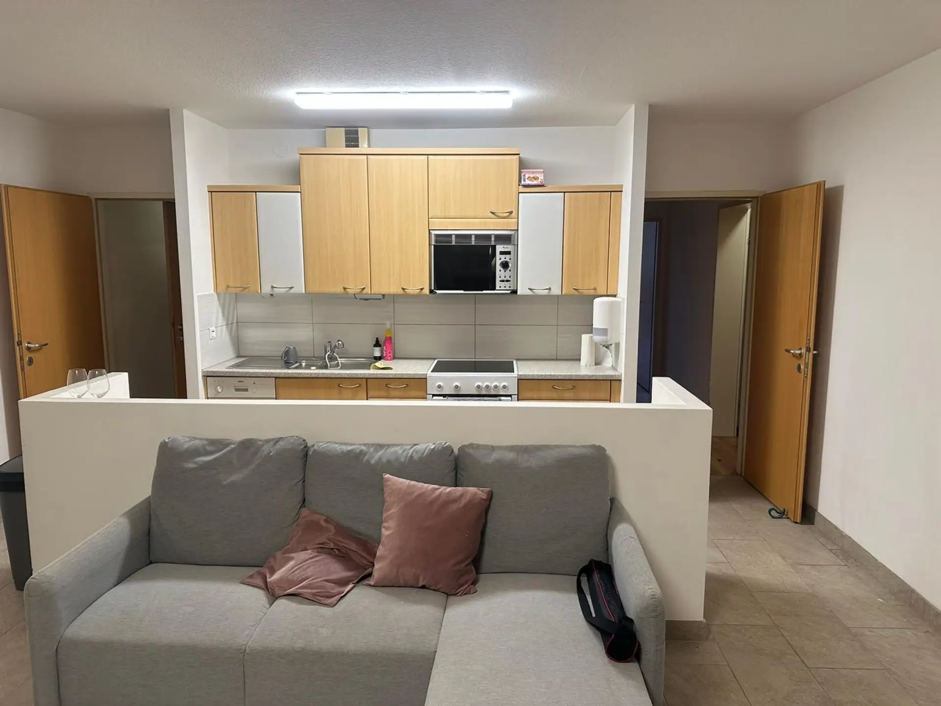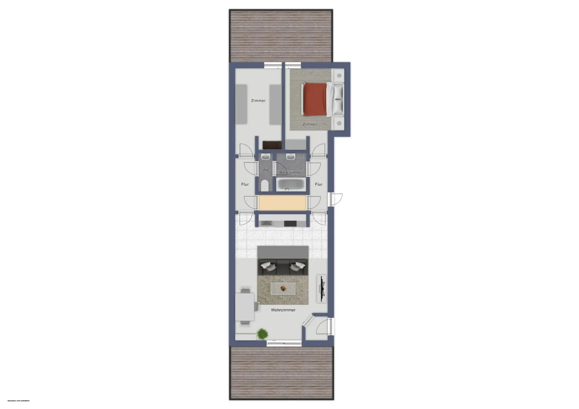 Links und rechts der Wohnküche befinden sich zwei kurze Flure, die jeweils zu einem eigenen Zimmer führen. Diese Aufteilung schafft zwei klar getrennte Bereiche – ideal als Schlafzimmer plus Homeoffice, als Kinderzimmer oder für Paare, die sich persönliche Rückzugsräume wünschen. Zwischen den beiden Fluren liegen Badezimmer und WC, die beide Räume miteinander verbinden. Dadurch entsteht ein cleverer, durchdachter Wohnungskern ohne Sackgassen und mit kurzen Wegen.