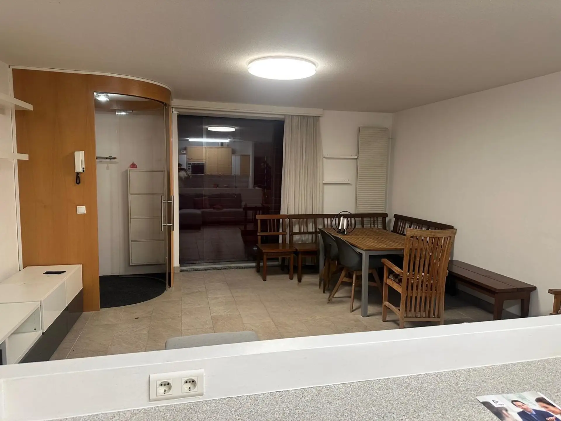Beim Betreten der Wohnung empfängt ein kompakter Vorraum, der direkt in die große Wohnküche führt – ein heller, offener Mittelpunkt des gesamten Grundrisses. Von der Wohnküche öffnet sich der Zugang zur ersten Terrasse, die wie ein kleiner privater Außenbereich funktioniert. Durch die Glasfront fällt viel Tageslicht in den Wohnraum, was der Wohnung ein angenehmes, warmes Raumgefühl gibt.