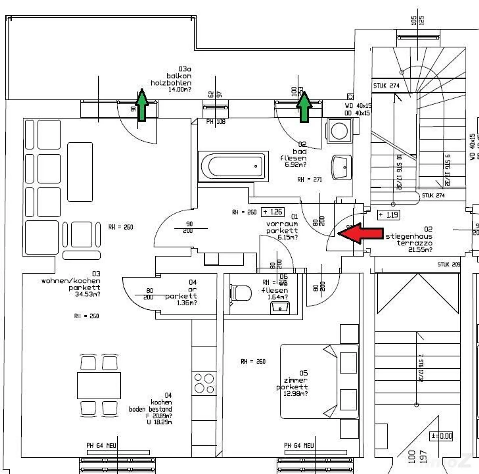 Vorraum, Badezimmer mit Wanne, Platz für die Waschmaschine und Ausgang auf den Balkon, extra WC mit Waschbecken, Schlafzimmer, Wohn-Esszimmer mit offener, neu möblierter Küche, Abstellraum. Vom Wohnzimmer gelangt man auf den großen überdachten Balkon. Ein Kellerersatzraum befindet sich im Innenhof und ist im Mietzins inkludiert.