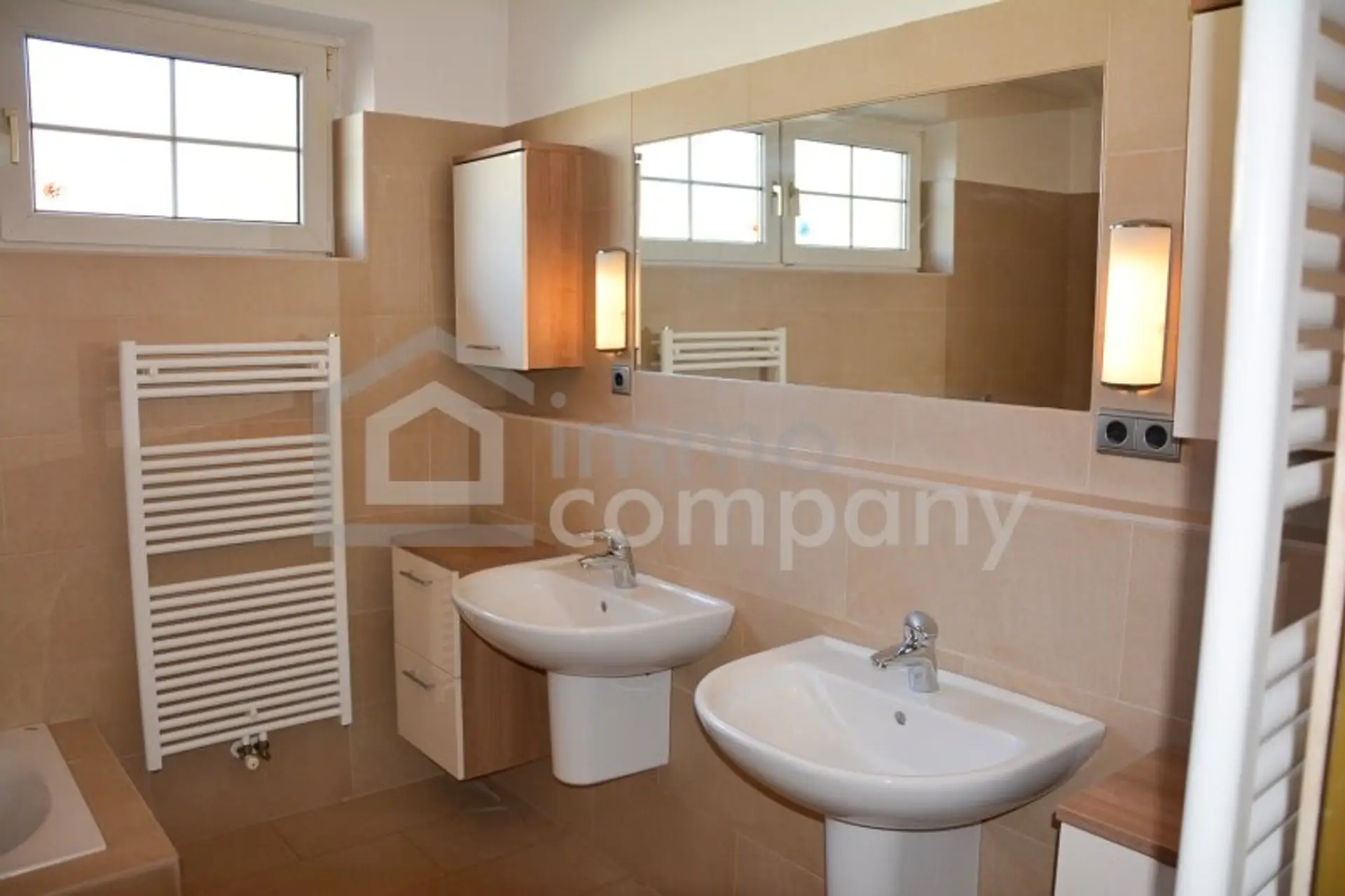 * 1 Badezimmer mit Badewanne, Dusche und Doppelwaschbecken