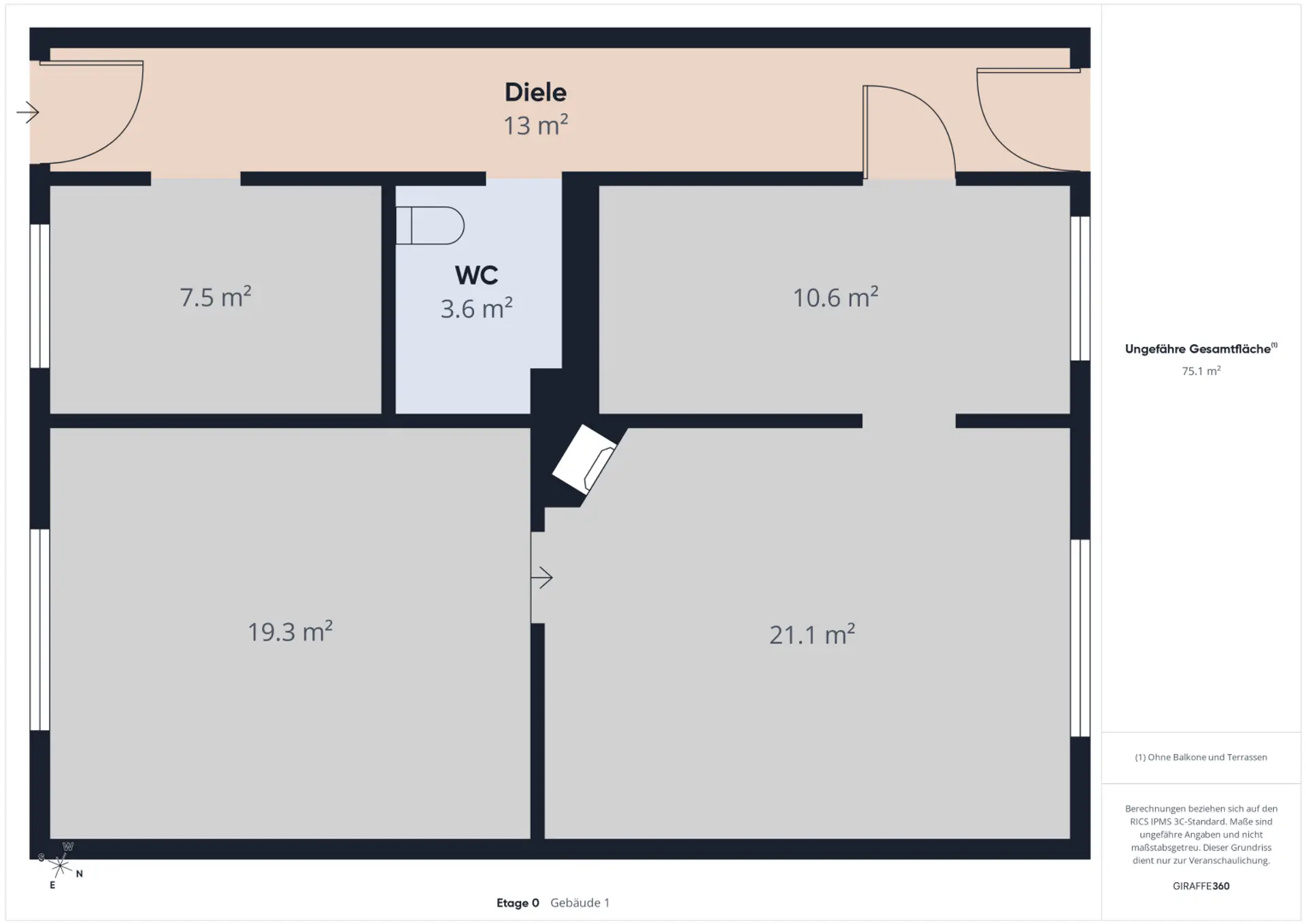 Auf einer Wohnfläche von ca. 75m² befinden sich Gang, Küche, zwei Zimmer, ein Kabinett, sowie ein Badezimmer mit WC.