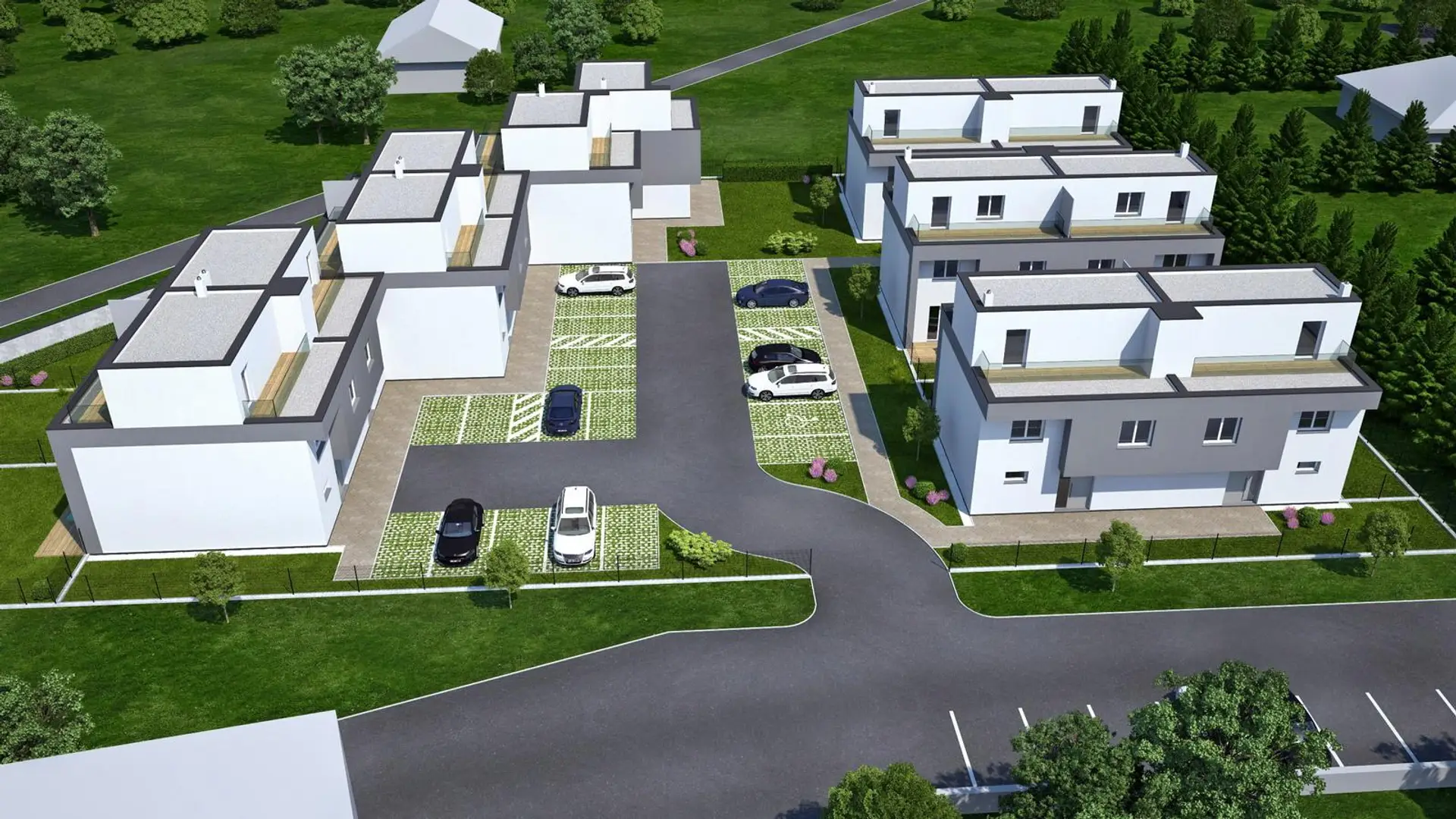 Ansicht oben ganze Anlage Strassenasicht Ansicht oben Ansicht Garten mit Terrasse Ansicht Innenanlage mit Parkplätzen Ansicht Innenanlage mit Zufahrt