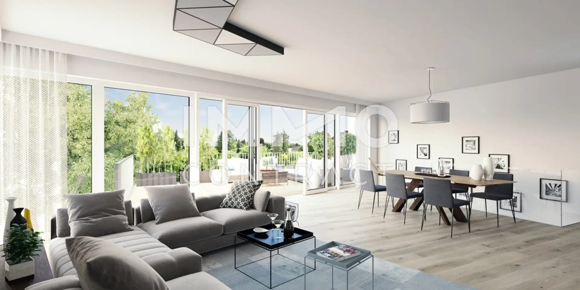 Das Leben in der Loiblsiedlung bedeutet Wohnen im Grünen, ohne auf Komfort zu verzichten: Jeder Schlaf-, Arbeits-, Gäste- und Kinderraum öffnet sich über eine Glastür direkt in den eigenen Garten. Der großzügige Wohnsalon mit weitläufiger Terrasse im Obergeschoss schafft ein unvergleichliches Raumgefühl.