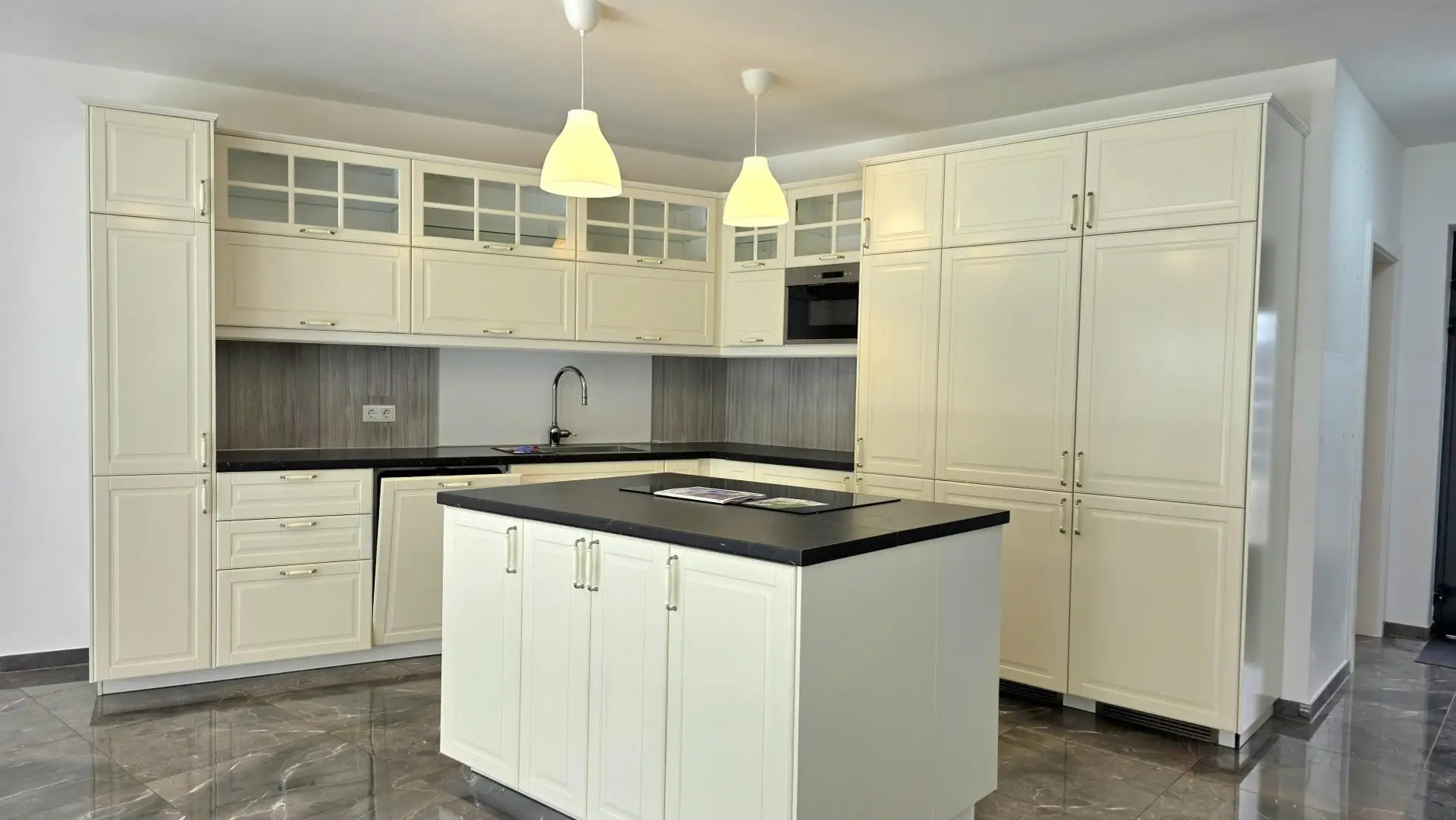 Weiter in den sehr hellen Wohnbereich, sehr große Terrassenfenster/türen, voll südseitig mit neuer, heller Landhausküche mit Kochinsel und keramischen Hochglanzfußböden/Fliesen auf der ganzen Etage.