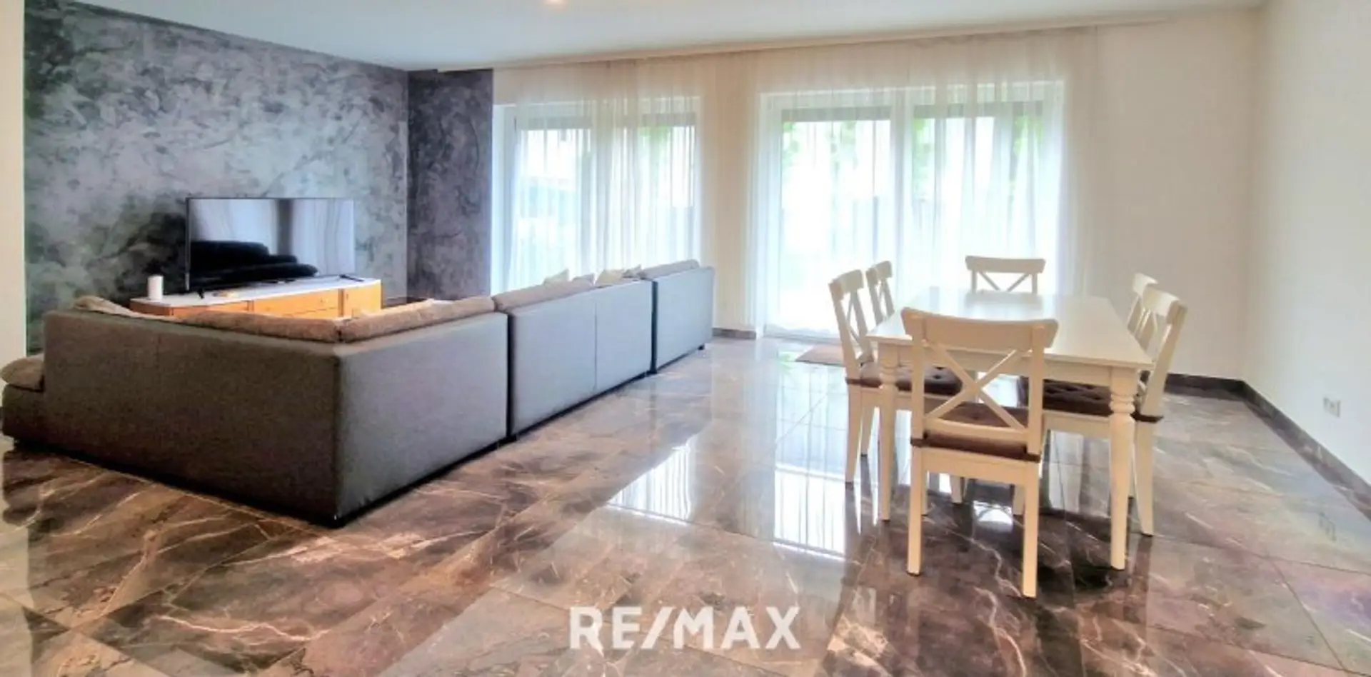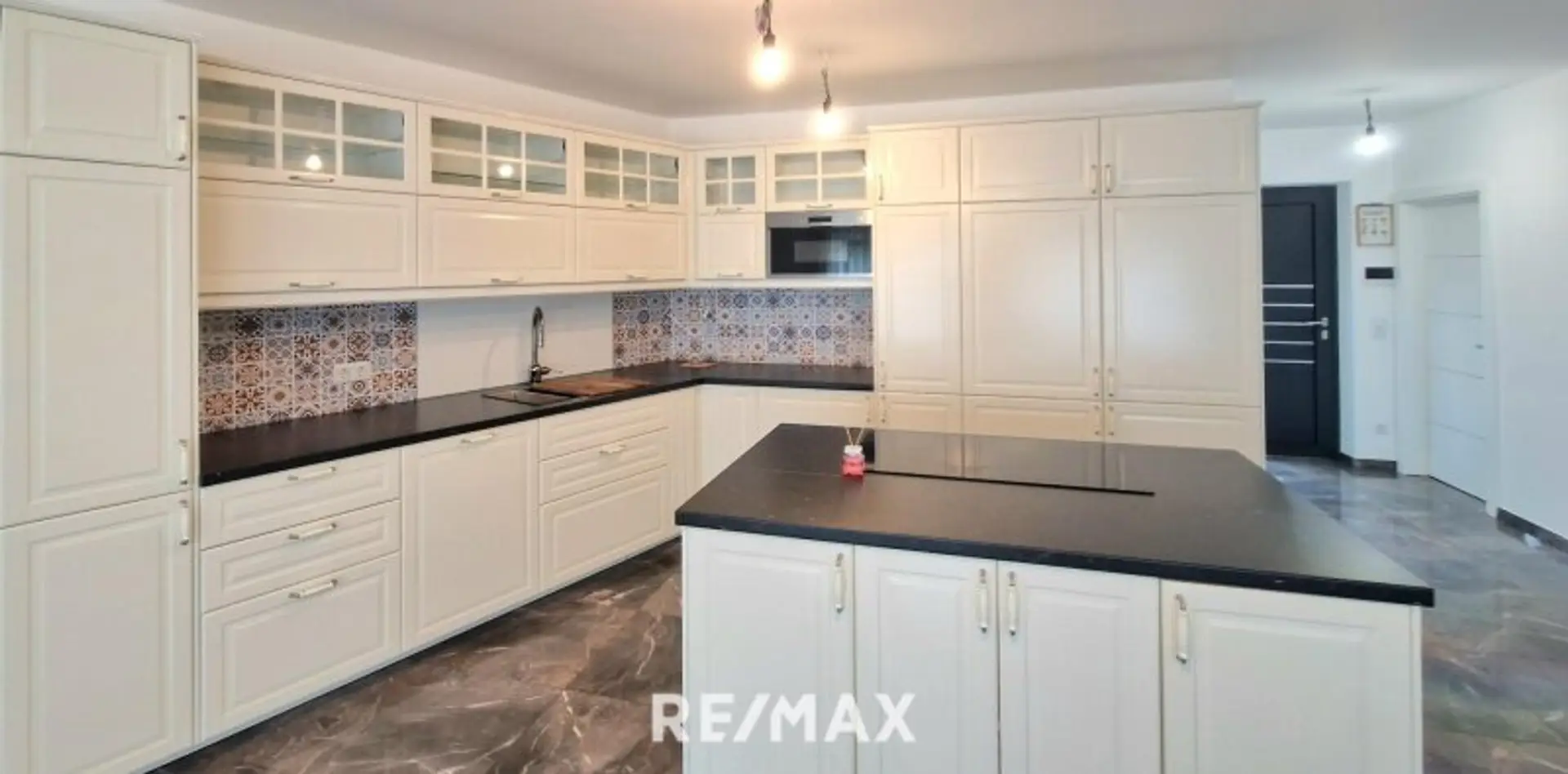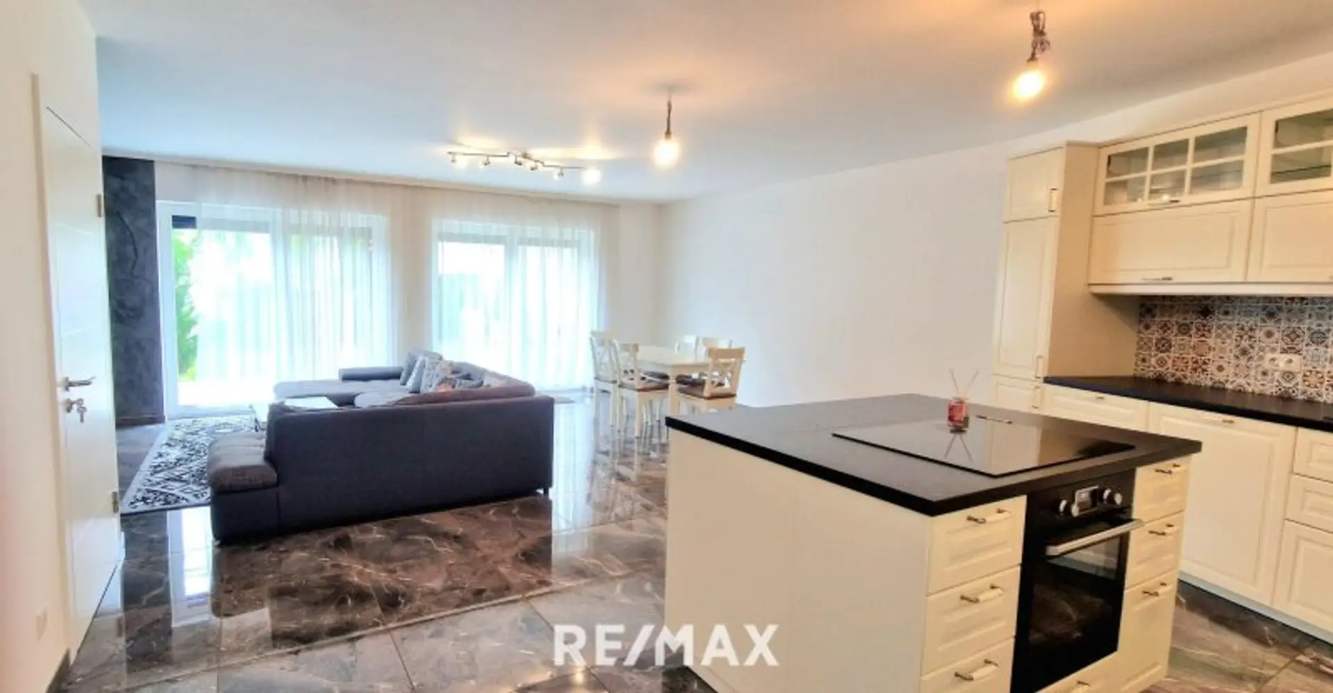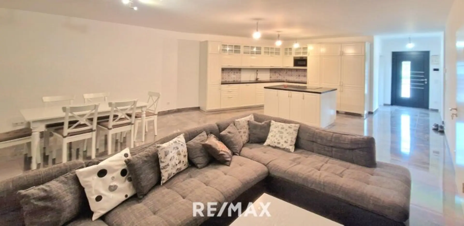 Weiter in den sehr hellen Wohnbereich, sehr große Terrassenfenster, voll südseitig mit neuer, heller Landhausküche mit Kochinsel und keramischen Hochglanzfußböden/Fliesen auf der ganzen Etage.