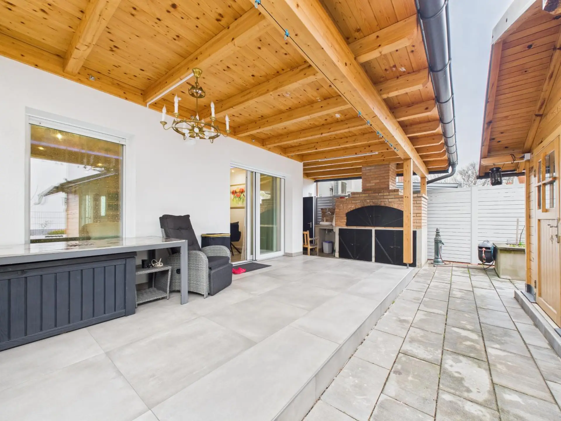überdachte Terrasse m. kleiner Grünfläche Gartenhaus und Grill
